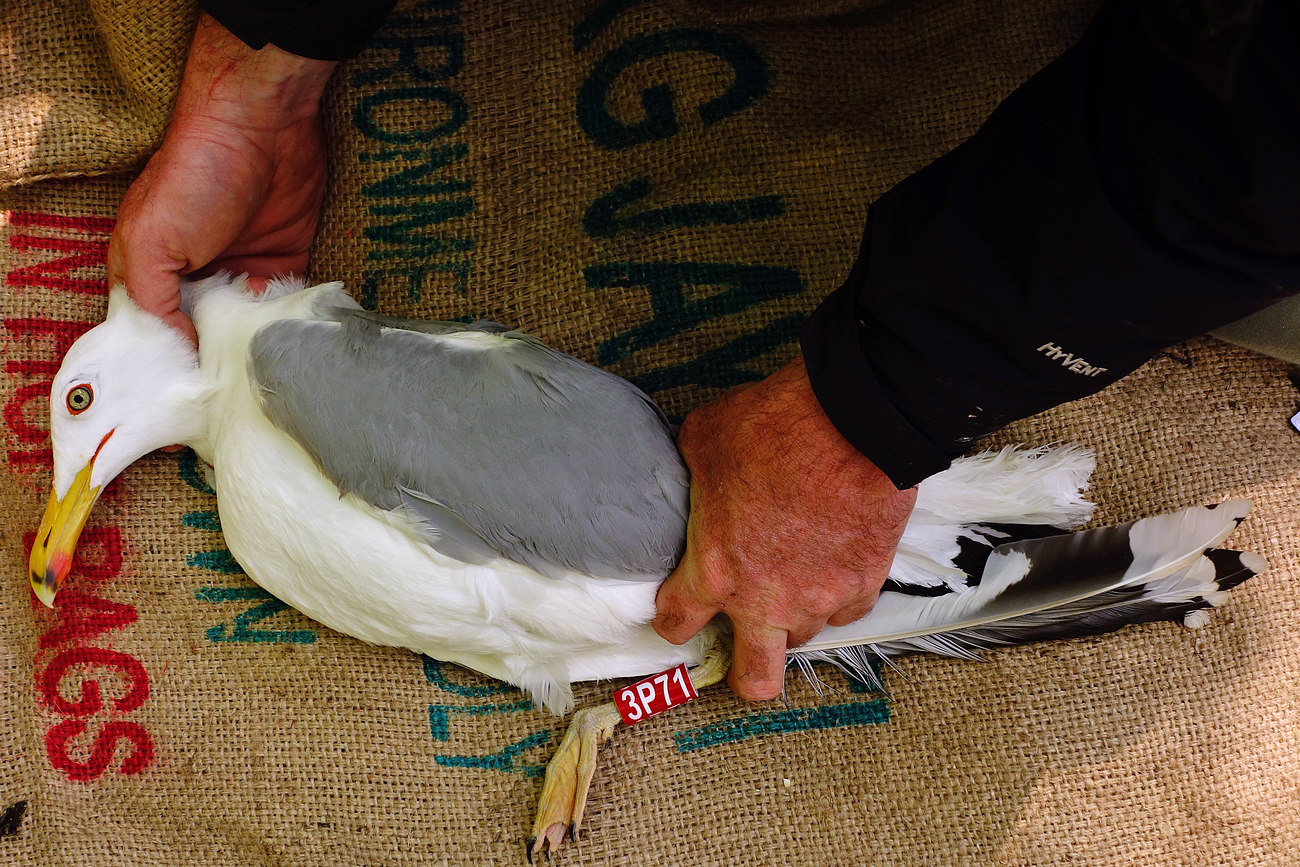 Larus cachinnans 3P71 adult, May 02 2014, Zastów Karczmiski, Poland. Picture: Łukasz Bednarz ringing team. Please visit Łukasz's BLOG for beautiful drawings and up-to-date gull news from eastern Poland: Wildlife art and illustration Location: Zastów Karczmiski, Poland - colony at the banks of the Middle Vistula river. Middle Vistule river is a location where several taxa breed: see composition. Since this is a mixed breeding population where hybridisation is not uncommon, the ringing centre in Poland decided to label birds "Larus argentatus sensu lato". Still bulk of the breeding birds in Middle Vistula region show features of cachinnans. Breeding bird trapped at the nest. Adult, with little speckling in iris. Red orbital ring and gape. No red on upper mandible; obvious black on the upper and on lower mandible.