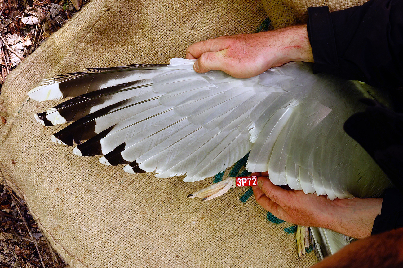 below: Larus argentatus sensu lato 3P72 adult, May 02 2014, Zastów Karczmiski, Poland. Picture: Łukasz Bednarz ringing team. Breeding bird trapped at the nest. Adult with powerful bill and relatively broad medial band. Little speckling in the otherwise clouded iris. Orange-red orbital ring and gape. No red on upper mandible; obvious black on the upper and on lower mandible.