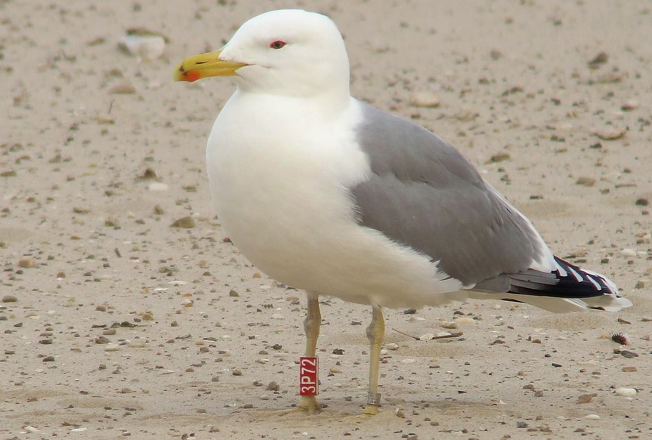 Larus argentatus sensu lato 3P72 adult, May 2014 & April 2015, Zastów Karczmiski, Poland. Picture: Łukasz Bednarz ringing team. Please visit Łukasz's BLOG for beautiful drawings and up-to-date gull news from eastern Poland: Wildlife art and illustration Location: Zastów Karczmiski, Poland - colony at the banks of the Middle Vistula river. Middle Vistule river is a location where several taxa breed: see composition. Since this is a mixed breeding population where hybridisation is not uncommon, the ringing centre in Poland decided to label birds "Larus argentatus sensu lato". Still bulk of the breeding birds in Middle Vistula region show features of cachinnans. below: Larus argentatus sensu lato 3P72 adult, April 20 2015, Zastów Karczmiski, Poland. Picture: Łukasz Bednarz ringing team. Probably cachinnans male, but from this angle, bird with huge gonys angle reminiscent of argentatus.