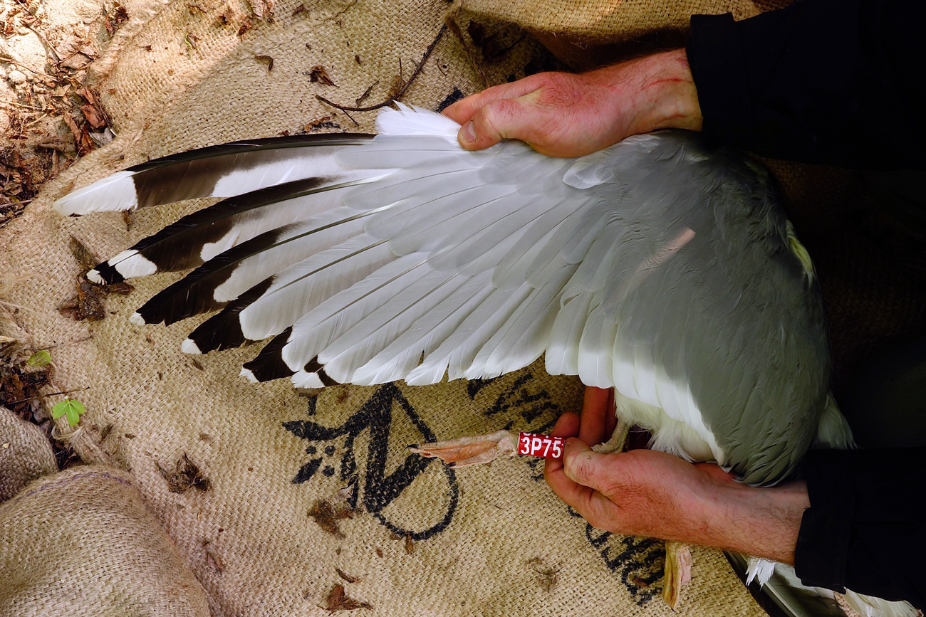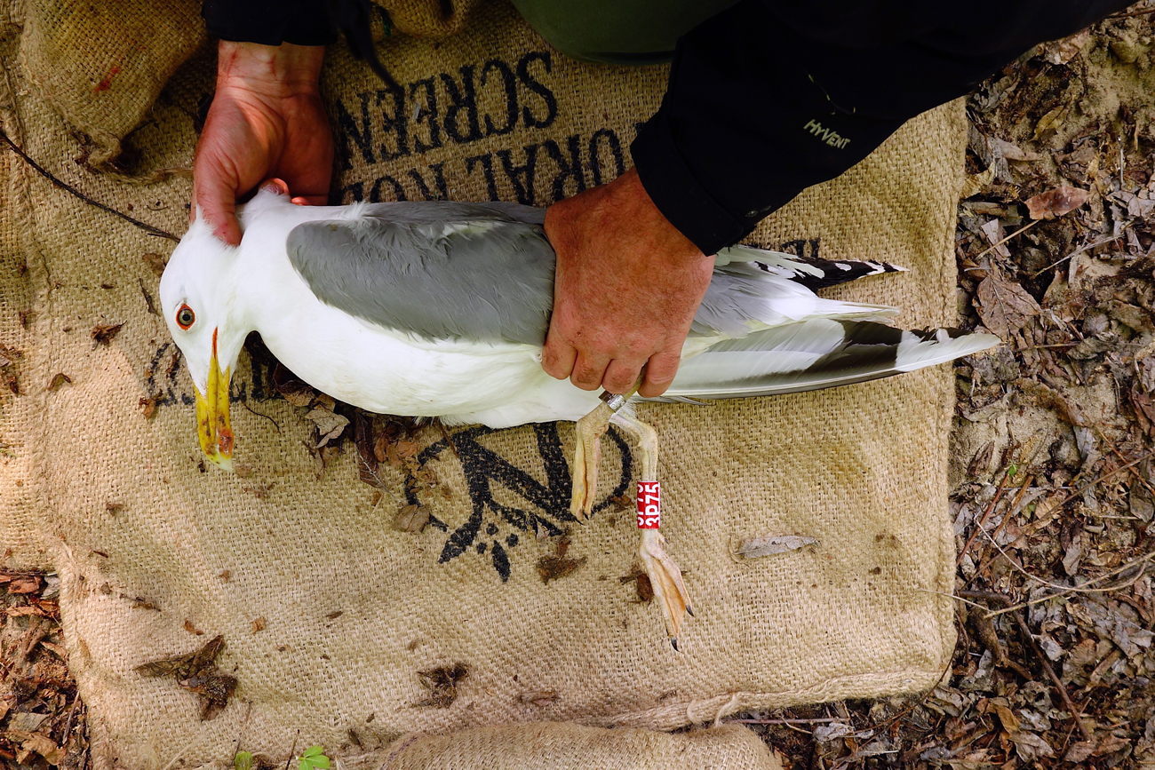 Larus cachinnans 3P75 adult, May 02 2014, Zastów Karczmiski, Poland. Picture: Łukasz Bednarz ringing team. Please visit Łukasz's BLOG for beautiful drawings and up-to-date gull news from eastern Poland: Wildlife art and illustration Location: Zastów Karczmiski, Poland - colony at the banks of the Middle Vistula river. Middle Vistule river is a location where several taxa breed: see composition. Since this is a mixed breeding population where hybridisation is not uncommon, the ringing centre in Poland decided to label birds "Larus argentatus sensu lato". Still bulk of the breeding birds in Middle Vistula region show features of cachinnans. Breeding bird trapped at the nest. Adult, with moderate speckling in iris. Red orbital ring and gape. No red on upper mandible.