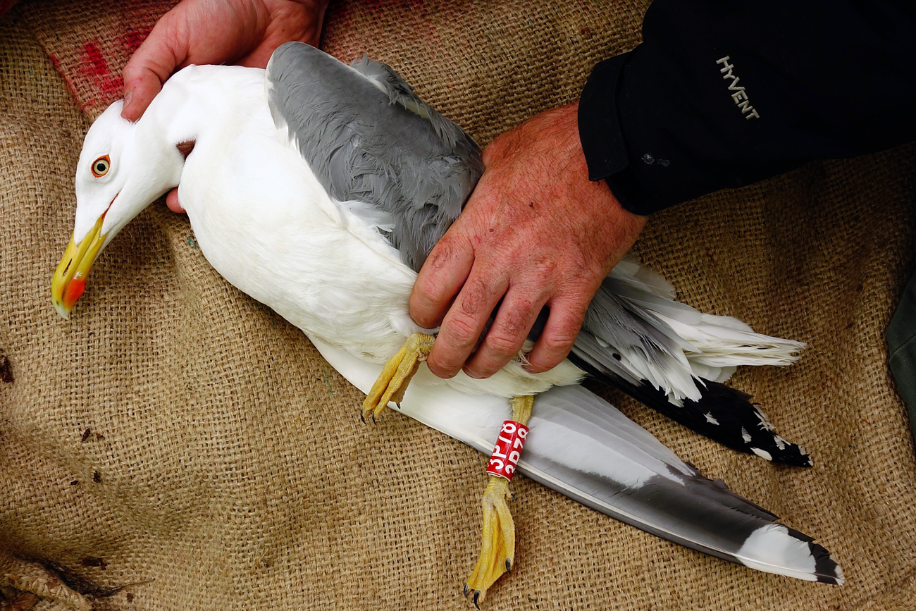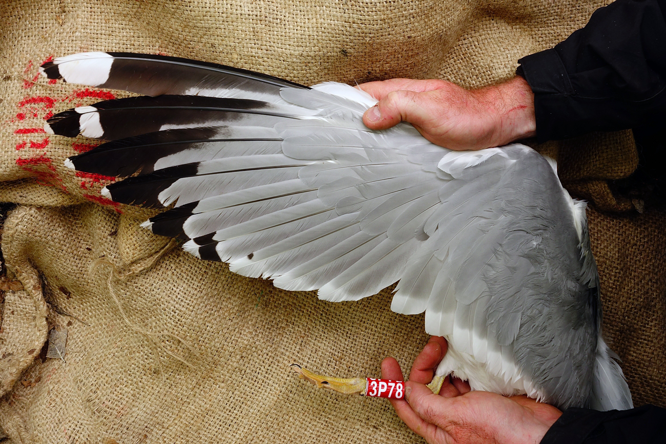Larus argentatus sensu lato 3P78 adult, May 02 2014, Zastów Karczmiski, Poland. Picture: Łukasz Bednarz ringing team. Please visit Łukasz's BLOG for beautiful drawings and up-to-date gull news from eastern Poland: Wildlife art and illustration Location: Zastów Karczmiski, Poland - colony at the banks of the Middle Vistula river. Middle Vistule river is a location where several taxa breed: see composition. Since this is a mixed breeding population where hybridisation is not uncommon, the ringing centre in Poland decided to label birds "Larus argentatus sensu lato". Still bulk of the breeding birds in Middle Vistula region show features of cachinnans. Probably at least some cachinnans influences. Breeding bird trapped at the nest. Adult with powerful bill and relatively broad medial band. Very little speckling in the yellow iris. Red orbital ring and gape. Faint red on upper mandible; small black mark on the upper mandible.