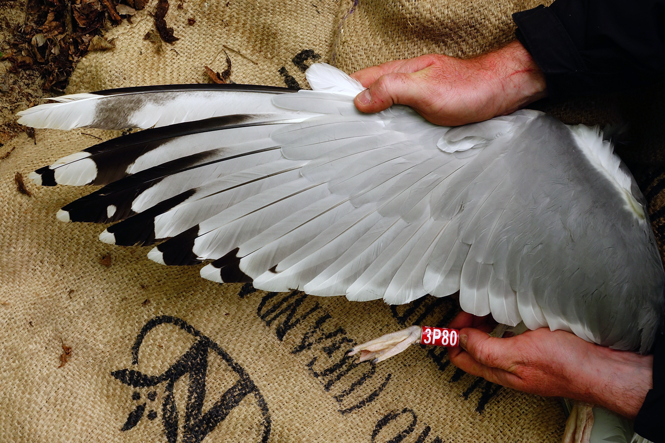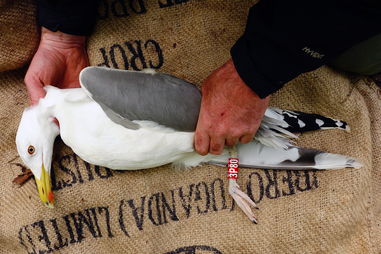 Larus cachinnans 3P80 adult, May 02 2014, Zastów Karczmiski, Poland. Picture: Łukasz Bednarz ringing team. Please visit Łukasz's BLOG for beautiful drawings and up-to-date gull news from eastern Poland: Wildlife art and illustration Location: Zastów Karczmiski, Poland - colony at the banks of the Middle Vistula river. Middle Vistule river is a location where several taxa breed: see composition. Since this is a mixed breeding population where hybridisation is not uncommon, the ringing centre in Poland decided to label birds "Larus argentatus sensu lato". Still bulk of the breeding birds in Middle Vistula region show features of cachinnans. Breeding bird trapped at the nest. Adult, with little speckling in iris. Red orbital ring and gape. No red on upper mandible; black on the upper and on lower mandible.