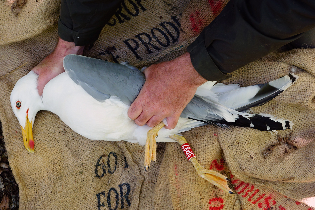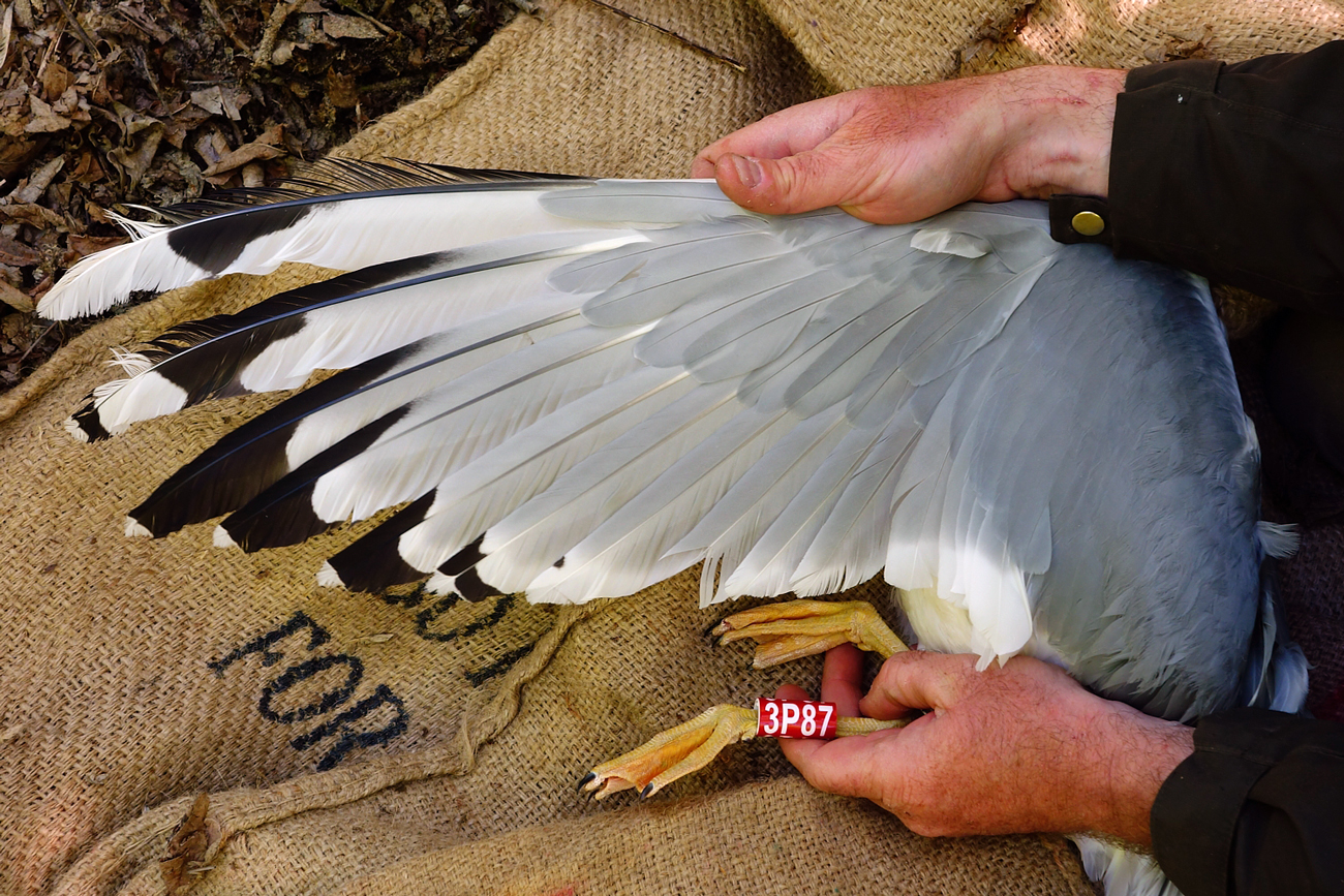 Larus cachinnans 3P87 adult, May 04 2014, Zastów Karczmiski, Poland. Picture: Łukasz Bednarz ringing team. Please visit Łukasz's BLOG for beautiful drawings and up-to-date gull news from eastern Poland: Wildlife art and illustration Location: Zastów Karczmiski, Poland - colony at the banks of the Middle Vistula river. Middle Vistule river is a location where several taxa breed: see composition. Since this is a mixed breeding population where hybridisation is not uncommon, the ringing centre in Poland decided to label birds "Larus argentatus sensu lato". Still bulk of the breeding birds in Middle Vistula region show features of cachinnans. Breeding bird trapped at the nest. Probably male with obvious gonys angle. Overall like michahellis, but wingtip pattern classic cachinnans.