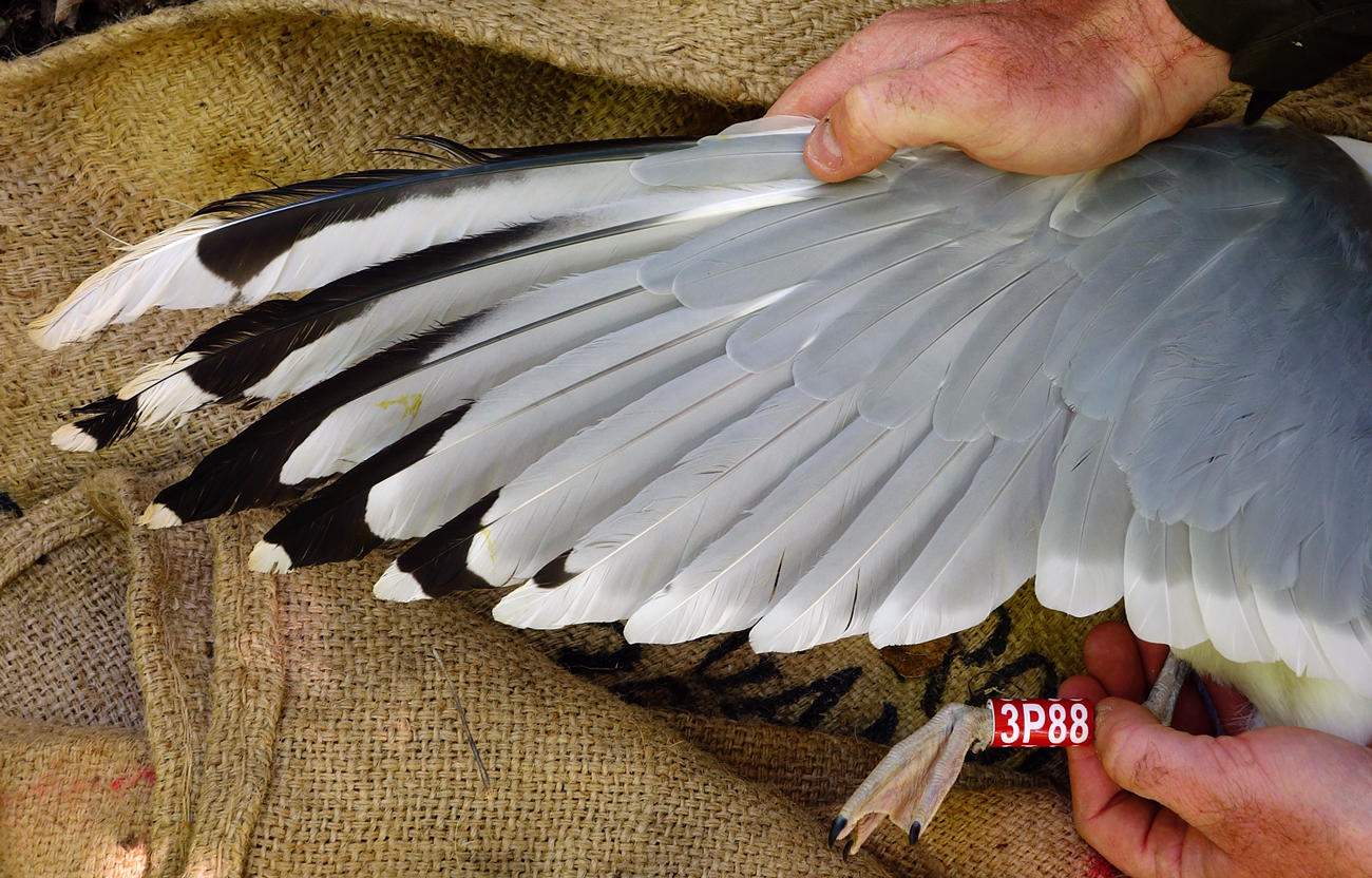 Larus cachinnans 3P88 adult, May 04 2014, Zastów Karczmiski, Poland. Picture: Łukasz Bednarz ringing team. Please visit Łukasz's BLOG for beautiful drawings and up-to-date gull news from eastern Poland: Wildlife art and illustration Location: Zastów Karczmiski, Poland - colony at the banks of the Middle Vistula river. Middle Vistule river is a location where several taxa breed: see composition. Since this is a mixed breeding population where hybridisation is not uncommon, the ringing centre in Poland decided to label birds "Larus argentatus sensu lato". Still bulk of the breeding birds in Middle Vistula region show features of cachinnans. Breeding bird trapped at the nest. Adult, probably female, with dense speckling in iris. Orange-red orbital ring and gape. No red on upper mandible; black on the upper but not on the lower mandible.