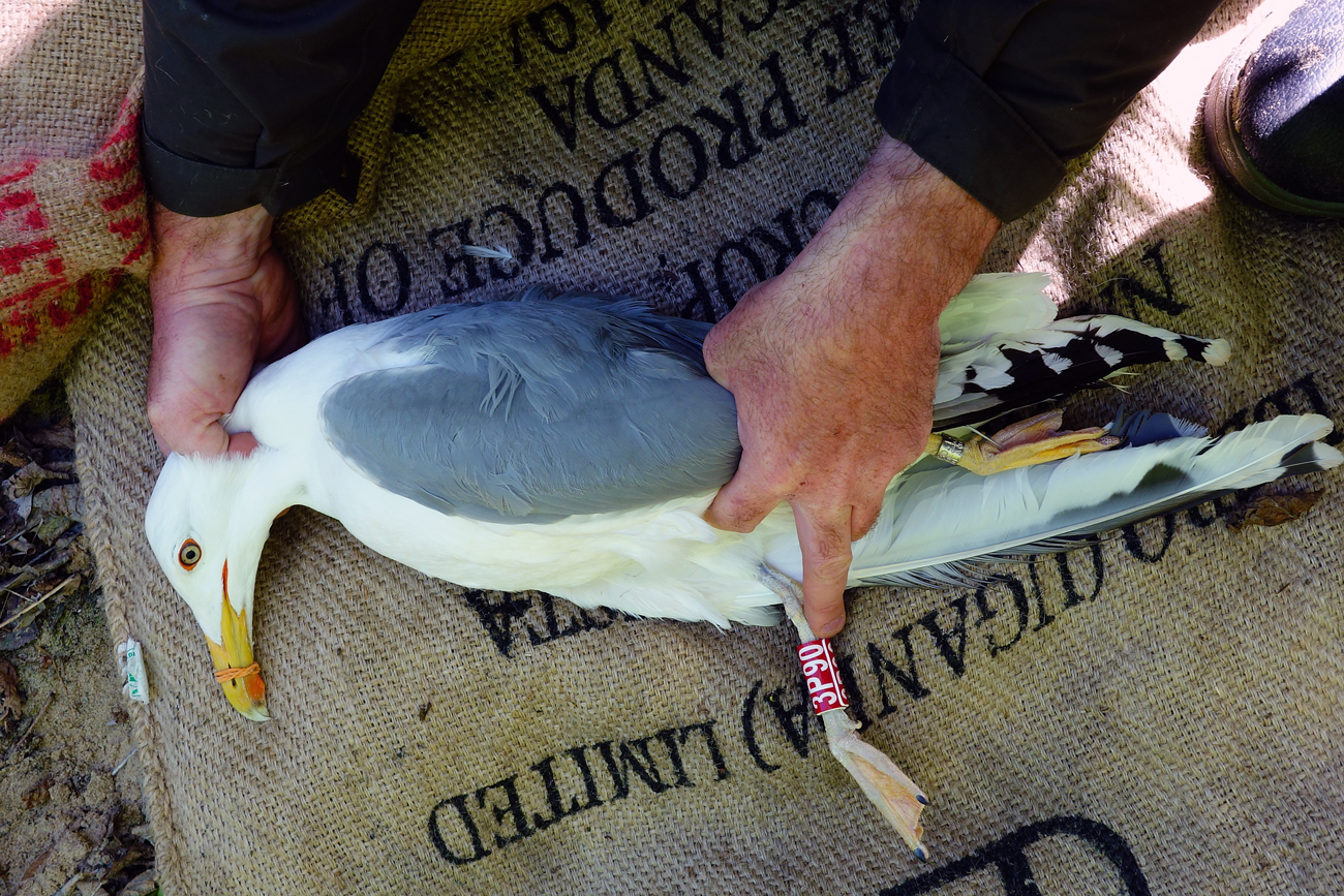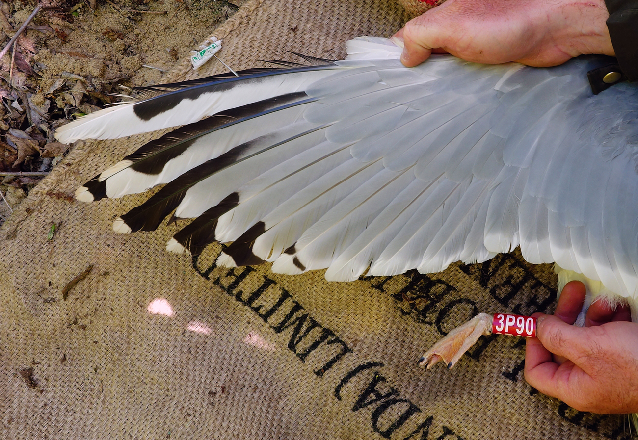 Larus cachinnans 3P90 adult, May 04 2014, Zastów Karczmiski, Poland. Picture: Łukasz Bednarz ringing team. Please visit Łukasz's BLOG for beautiful drawings and up-to-date gull news from eastern Poland: Wildlife art and illustration Location: Zastów Karczmiski, Poland - colony at the banks of the Middle Vistula river. Middle Vistule river is a location where several taxa breed: see composition. Since this is a mixed breeding population where hybridisation is not uncommon, the ringing centre in Poland decided to label birds "Larus argentatus sensu lato". Still bulk of the breeding birds in Middle Vistula region show features of cachinnans. Breeding bird trapped at the nest. Adult, with very limited speckling in iris. Orange-red orbital ring and gape. No red on upper mandible; black on the upper and on the lower mandible.