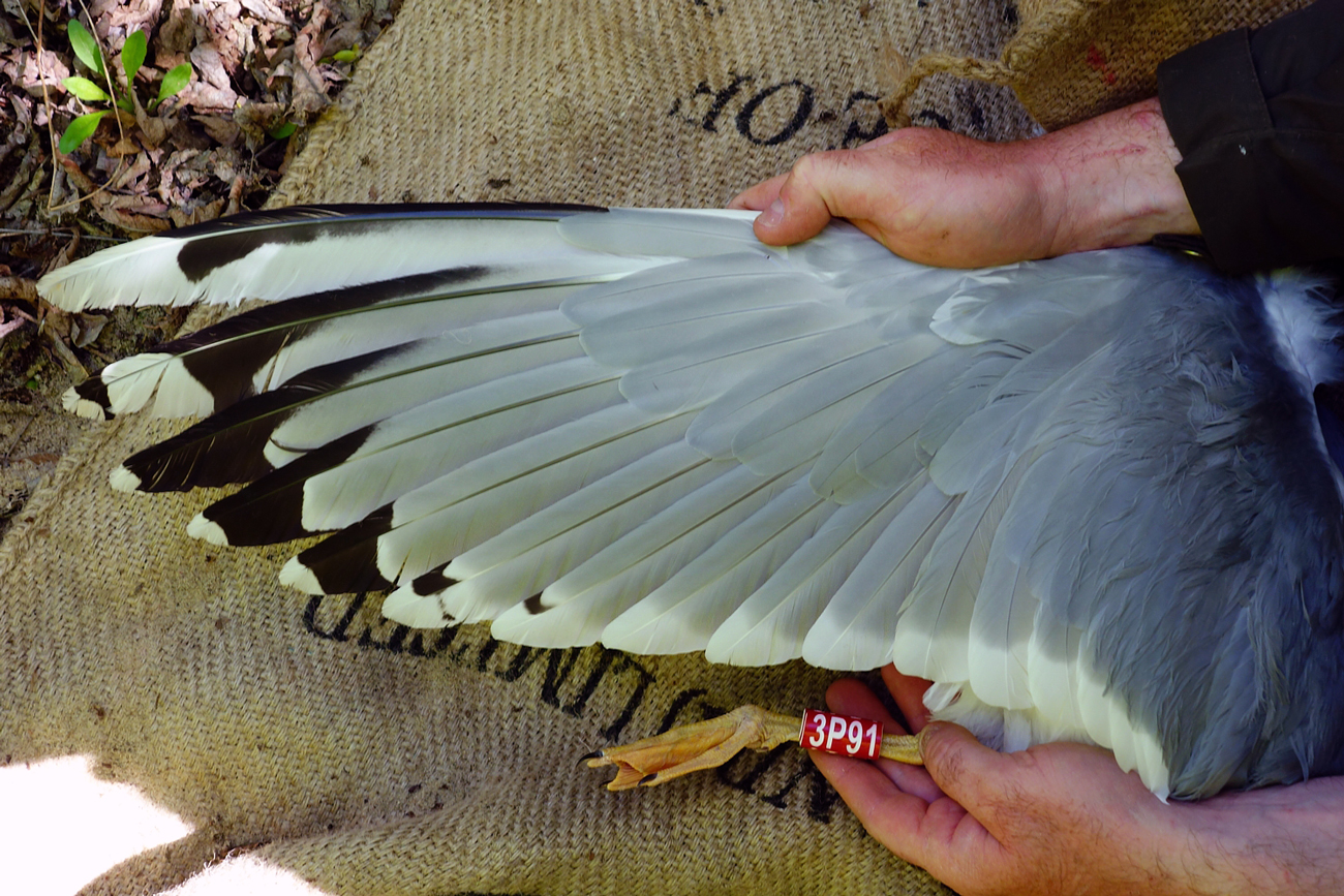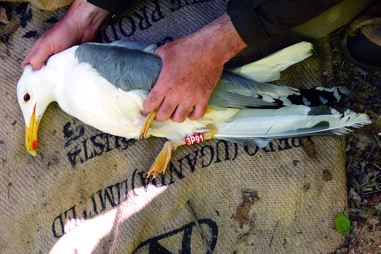 Larus cachinnans 3P91 adult, May 04 2014, Zastów Karczmiski, Poland. Picture: Łukasz Bednarz ringing team. Please visit Łukasz's BLOG for beautiful drawings and up-to-date gull news from eastern Poland: Wildlife art and illustration Location: Zastów Karczmiski, Poland - colony at the banks of the Middle Vistula river. Middle Vistule river is a location where several taxa breed: see composition. Since this is a mixed breeding population where hybridisation is not uncommon, the ringing centre in Poland decided to label birds "Larus argentatus sensu lato". Still bulk of the breeding birds in Middle Vistula region show features of cachinnans. Breeding bird trapped at the nest. Adult, with dense speckling in iris. Red orbital ring and gape. No red on upper mandible; black on the upper and on the lower mandible.