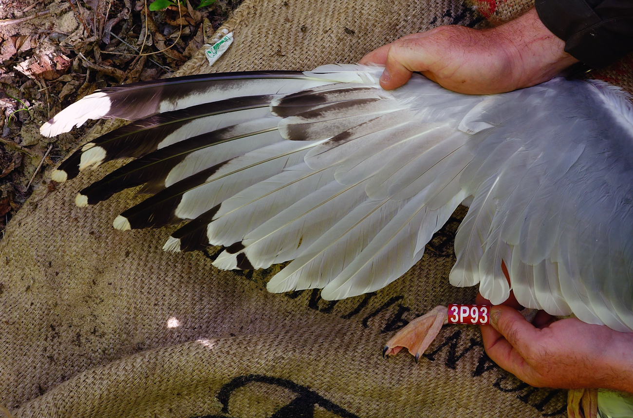 Larus cachinnans 3P93 sub-adult, May 04 2014, Zastów Karczmiski, Poland. Picture: Łukasz Bednarz ringing team. Please visit Łukasz's BLOG for beautiful drawings and up-to-date gull news from eastern Poland: Wildlife art and illustration Location: Zastów Karczmiski, Poland - colony at the banks of the Middle Vistula river. Middle Vistule river is a location where several taxa breed: see composition. Since this is a mixed breeding population where hybridisation is not uncommon, the ringing centre in Poland decided to label birds "Larus argentatus sensu lato". Still bulk of the breeding birds in Middle Vistula region show features of cachinnans. Breeding bird trapped at the nest. Sub-adult (4CY/5CY) with black markings in primary coverts.