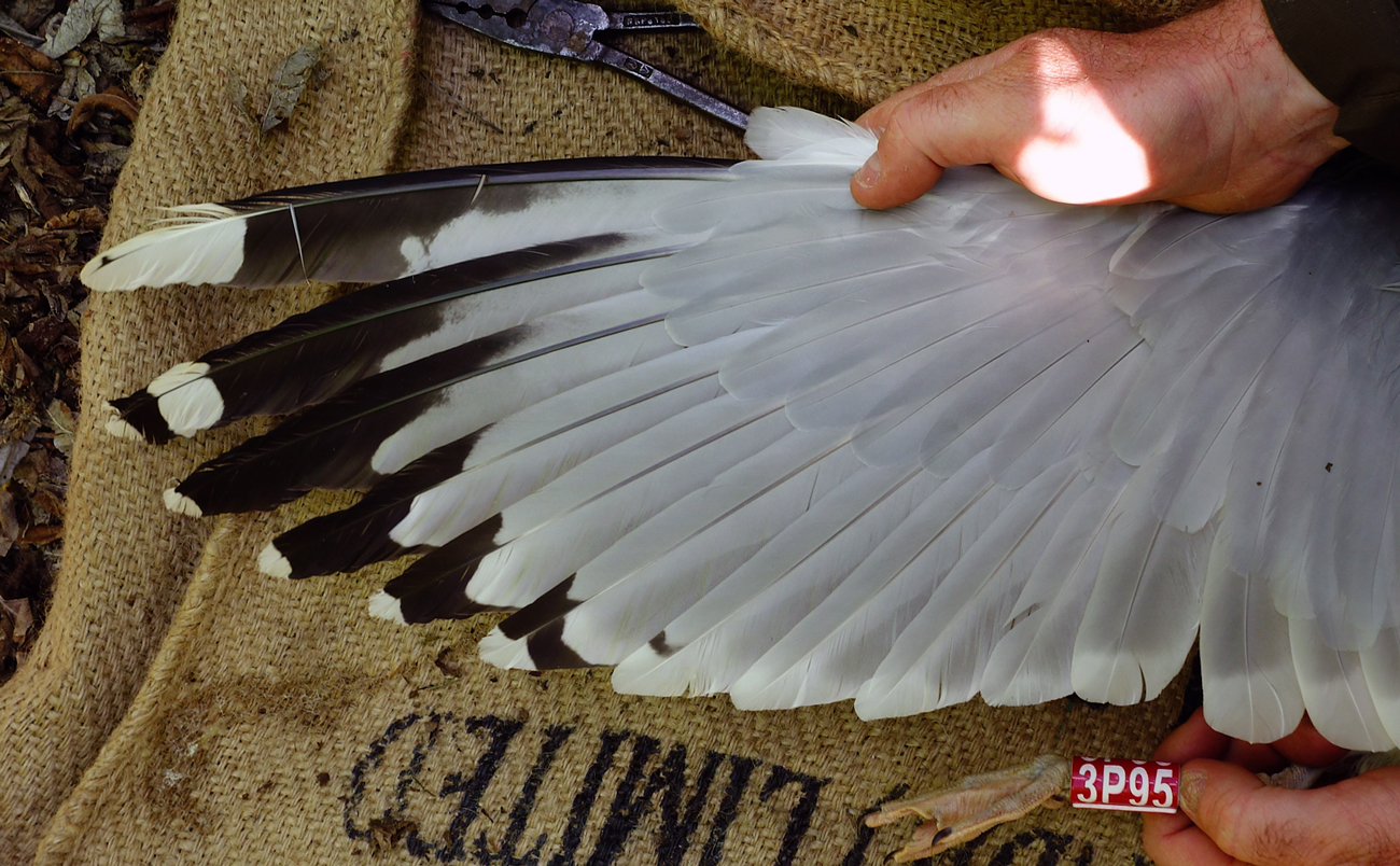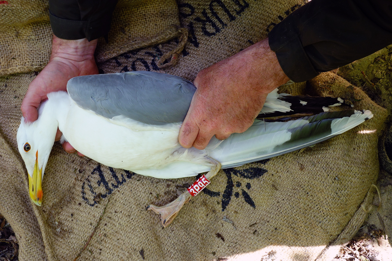 Larus cachinnans 3P95 adult, May 04 2014, Zastów Karczmiski, Poland. Picture: Łukasz Bednarz ringing team. Please visit Łukasz's BLOG for beautiful drawings and up-to-date gull news from eastern Poland: Wildlife art and illustration Location: Zastów Karczmiski, Poland - colony at the banks of the Middle Vistula river. Middle Vistule river is a location where several taxa breed: see composition. Since this is a mixed breeding population where hybridisation is not uncommon, the ringing centre in Poland decided to label birds "Larus argentatus sensu lato". Still bulk of the breeding birds in Middle Vistula region show features of cachinnans. Breeding bird trapped at the nest. Adult, with dense speckling in iris. Orange-red orbital ring and gape. Faint red on upper mandible; black on the upper and on the lower mandible.