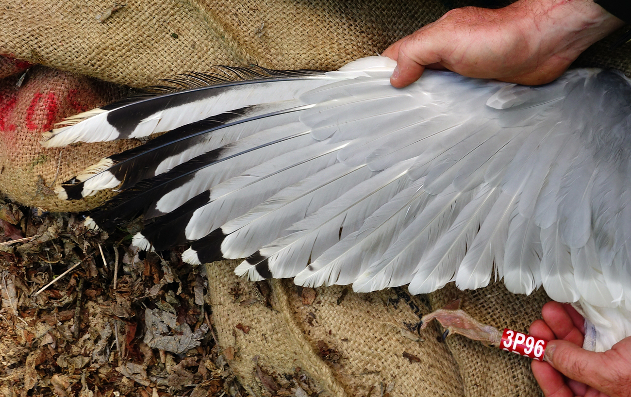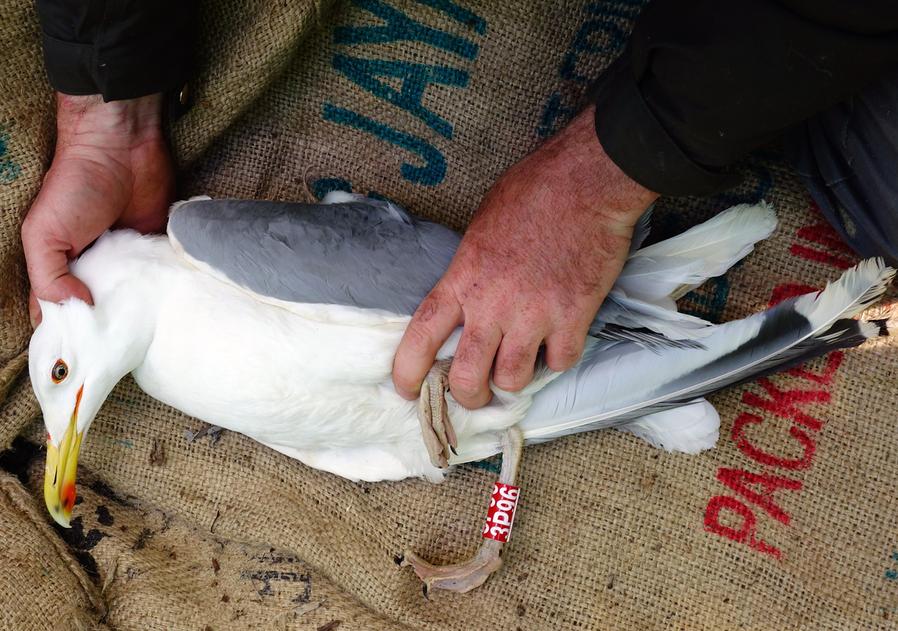 Larus cachinnans 3P96 adult, May 04 2014, Zastów Karczmiski, Poland. Picture: Łukasz Bednarz ringing team. Please visit Łukasz's BLOG for beautiful drawings and up-to-date gull news from eastern Poland: Wildlife art and illustration Location: Zastów Karczmiski, Poland - colony at the banks of the Middle Vistula river. Middle Vistule river is a location where several taxa breed: see composition. Since this is a mixed breeding population where hybridisation is not uncommon, the ringing centre in Poland decided to label birds "Larus argentatus sensu lato". Still bulk of the breeding birds in Middle Vistula region show features of cachinnans. Breeding bird trapped at the nest. Adult, with dense speckling in iris. Orange-red orbital ring and gape. No red on upper mandible; black on the upper and on the lower mandible.