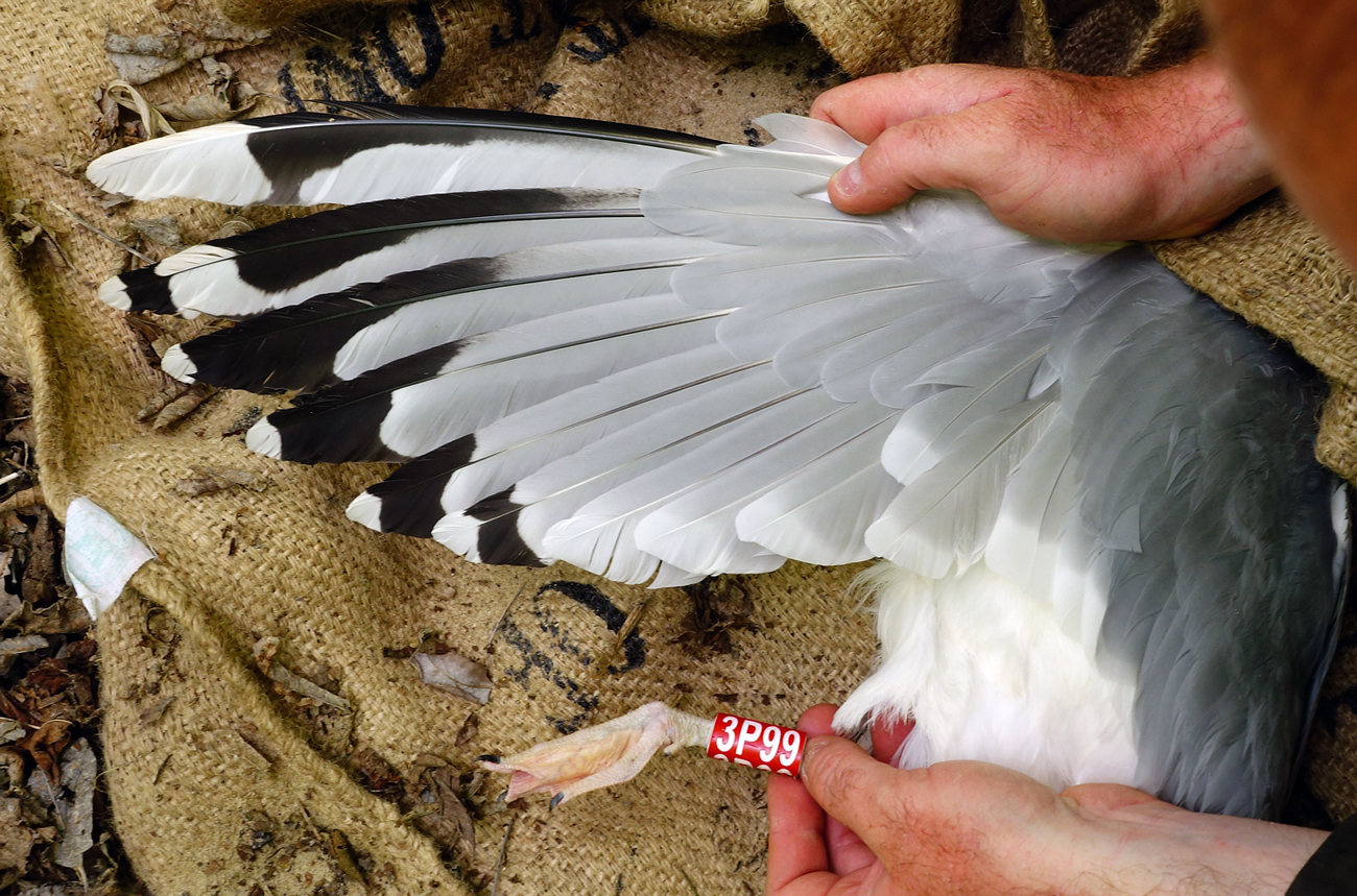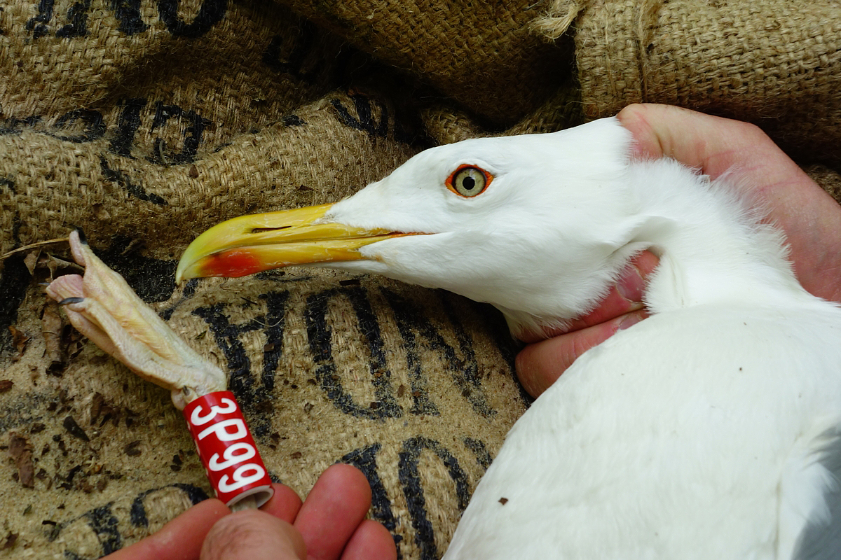 Larus cachinnans 3P99 adult, May 04 2014, Zastów Karczmiski, Poland. Picture: Łukasz Bednarz ringing team. Please visit Łukasz's BLOG for beautiful drawings and up-to-date gull news from eastern Poland: Wildlife art and illustration Location: Zastów Karczmiski, Poland - colony at the banks of the Middle Vistula river. Middle Vistule river is a location where several taxa breed: see composition. Since this is a mixed breeding population where hybridisation is not uncommon, the ringing centre in Poland decided to label birds "Larus argentatus sensu lato". Still bulk of the breeding birds in Middle Vistula region show features of cachinnans. Breeding bird trapped at the nest. Adult, with very limited speckling in iris. Orange-red orbital ring and gape. Nor red on upper mandible; no black on the upper and some black on the lower mandible.