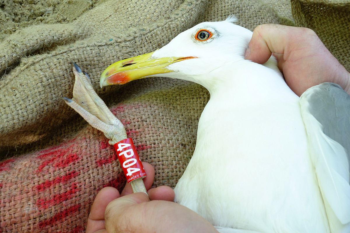 Larus cachinnans 4P04 adult, May 05 2014, Zastów Karczmiski, Poland. Picture: Łukasz Bednarz ringing team. Please visit Łukasz's BLOG for beautiful drawings and up-to-date gull news from eastern Poland: Wildlife art and illustration Location: Zastów Karczmiski, Poland - colony at the banks of the Middle Vistula river. Middle Vistule river is a location where several taxa breed: see composition. Since this is a mixed breeding population where hybridisation is not uncommon, the ringing centre in Poland decided to label birds "Larus argentatus sensu lato". Still bulk of the breeding birds in Middle Vistula region show features of cachinnans. Breeding bird trapped at the nest. Adult, with dense speckling in iris. Red orbital ring and gape. Red on upper mandible; black on the upper and faint black on the lower mandible.