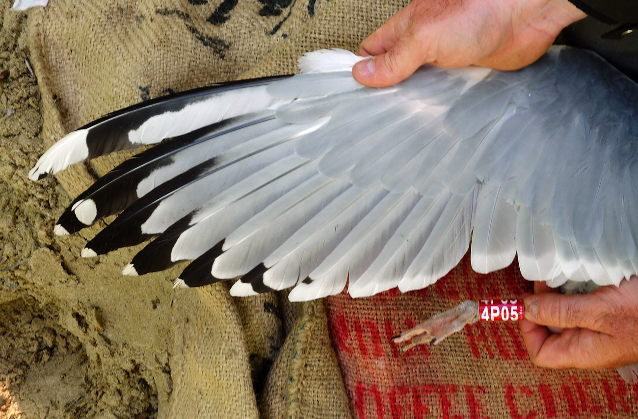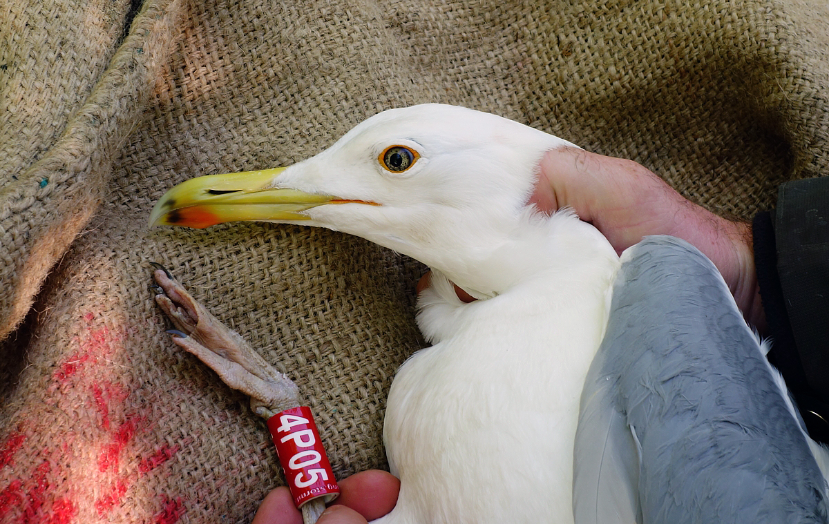 Larus cachinnans 4P05 adult, May 05 2014, Zastów Karczmiski, Poland. Picture: Łukasz Bednarz ringing team. Please visit Łukasz's BLOG for beautiful drawings and up-to-date gull news from eastern Poland: Wildlife art and illustration Location: Zastów Karczmiski, Poland - colony at the banks of the Middle Vistula river. Middle Vistule river is a location where several taxa breed: see composition. Since this is a mixed breeding population where hybridisation is not uncommon, the ringing centre in Poland decided to label birds "Larus argentatus sensu lato". Still bulk of the breeding birds in Middle Vistula region show features of cachinnans. Breeding bird trapped at the nest. Adult, with dense speckling in iris. Orange orbital ring and gape. No red on upper mandible; black on the upper and on the lower mandible.