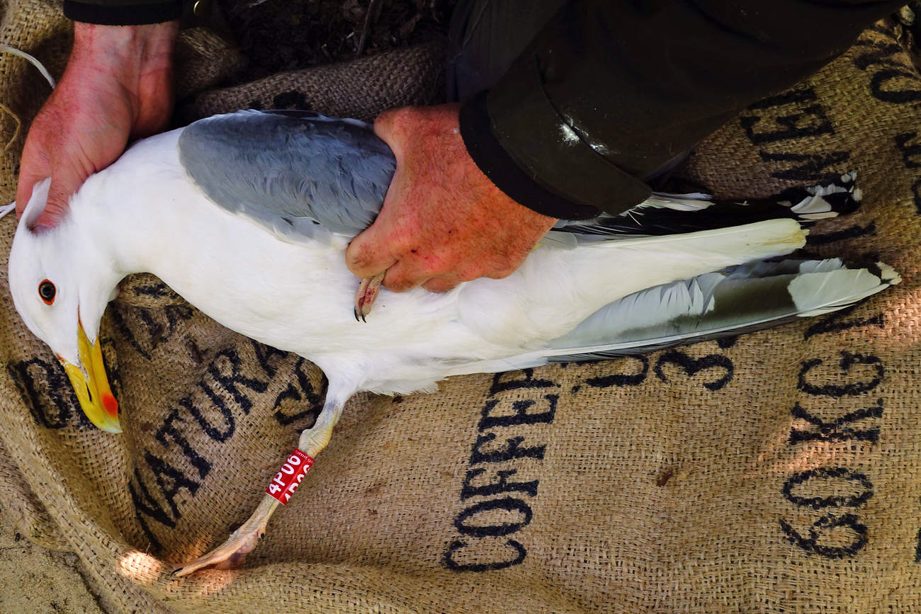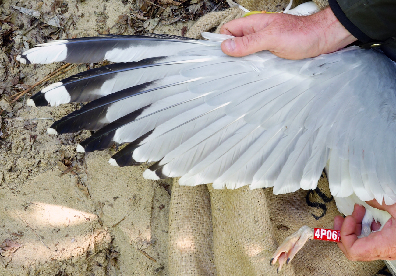 Larus cachinnans 4P06 adult, May 05 2014, Zastów Karczmiski, Poland. Picture: Łukasz Bednarz ringing team. Please visit Łukasz's BLOG for beautiful drawings and up-to-date gull news from eastern Poland: Wildlife art and illustration Location: Zastów Karczmiski, Poland - colony at the banks of the Middle Vistula river. Middle Vistule river is a location where several taxa breed: see composition. Since this is a mixed breeding population where hybridisation is not uncommon, the ringing centre in Poland decided to label birds "Larus argentatus sensu lato". Still bulk of the breeding birds in Middle Vistula region show features of cachinnans. Breeding bird trapped at the nest. Adult, with dense speckling in iris. Red orbital ring and gape. No red on upper mandible; faint black on the upper but not on the lower mandible.