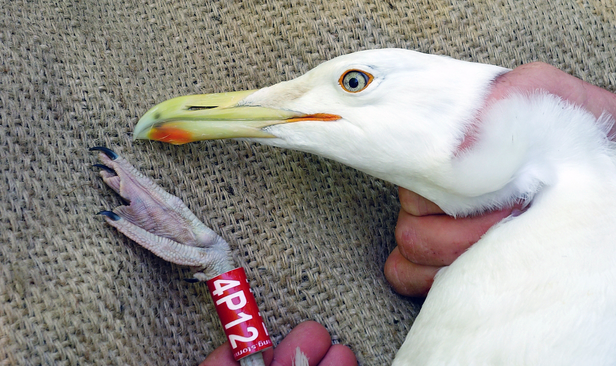 Larus cachinnans 4P12 adult, May 05 2014, Zastów Karczmiski, Poland. Picture: Łukasz Bednarz ringing team. Please visit Łukasz's BLOG for beautiful drawings and up-to-date gull news from eastern Poland: Wildlife art and illustration Location: Zastów Karczmiski, Poland - colony at the banks of the Middle Vistula river. Middle Vistule river is a location where several taxa breed: see composition. Since this is a mixed breeding population where hybridisation is not uncommon, the ringing centre in Poland decided to label birds "Larus argentatus sensu lato". Still bulk of the breeding birds in Middle Vistula region show features of cachinnans. Breeding bird trapped at the nest. Adult, with moderate speckling in iris. Orange-red orbital ring and gape. No red on upper mandible; black on the upper and on the lower mandible.