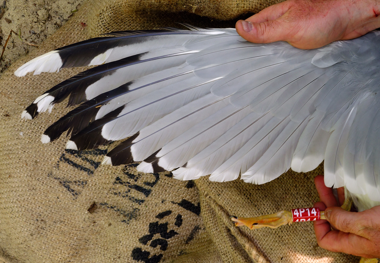 Larus cachinnans 4P14 adult, May 05 2014, Zastów Karczmiski, Poland. Picture: Łukasz Bednarz ringing team. Please visit Łukasz's BLOG for beautiful drawings and up-to-date gull news from eastern Poland: Wildlife art and illustration Location: Zastów Karczmiski, Poland - colony at the banks of the Middle Vistula river. Middle Vistule river is a location where several taxa breed: see composition. Since this is a mixed breeding population where hybridisation is not uncommon, the ringing centre in Poland decided to label birds "Larus argentatus sensu lato". Still bulk of the breeding birds in Middle Vistula region show features of cachinnans. Breeding bird trapped at the nest. Adult, with dense speckling in iris. Orange-red orbital ring and gape. No red on upper mandible; faint black on the upper and no black on the lower mandible. Saturated yellow legs.