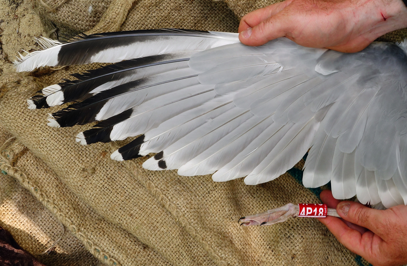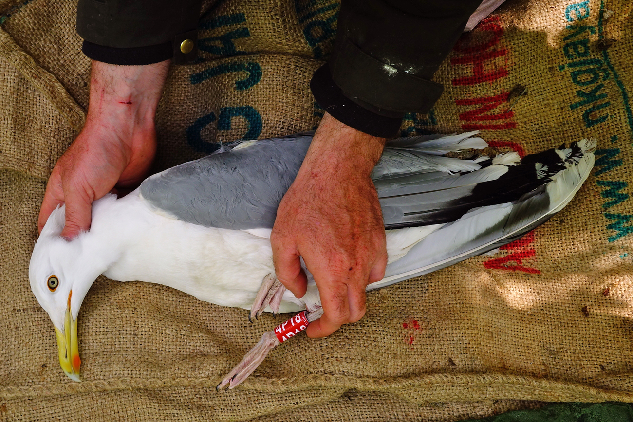 Larus argentatus sensu lato 4P18 adult, May 05 2014 & October 25 2014, Zastów Karczmiski & Wroclaw, Odra River, Poland. Picture: Łukasz Bednarz ringing team. Please visit Łukasz's BLOG for beautiful drawings and up-to-date gull news from eastern Poland: Wildlife art and illustration Location: Zastów Karczmiski, Poland - colony at the banks of the Middle Vistula river. Middle Vistule river is a location where several taxa breed: see composition. Since this is a mixed breeding population where hybridisation is not uncommon, the ringing centre in Poland decided to label birds "Larus argentatus sensu lato". Still bulk of the breeding birds in Middle Vistula region show features of cachinnans. below: Larus argentatus sensu lato 4P18 adult, May 05 2014, Zastów Karczmiski, Poland. Picture: Łukasz Bednarz ringing team. Breeding bird trapped at the nest, showing some similarity to argentatus (F2?) in clean iris, obvious gonys (Bill ratio: 3,15), really pink legs and orange orbital ring. All these features can be found in cachinnans as well however.