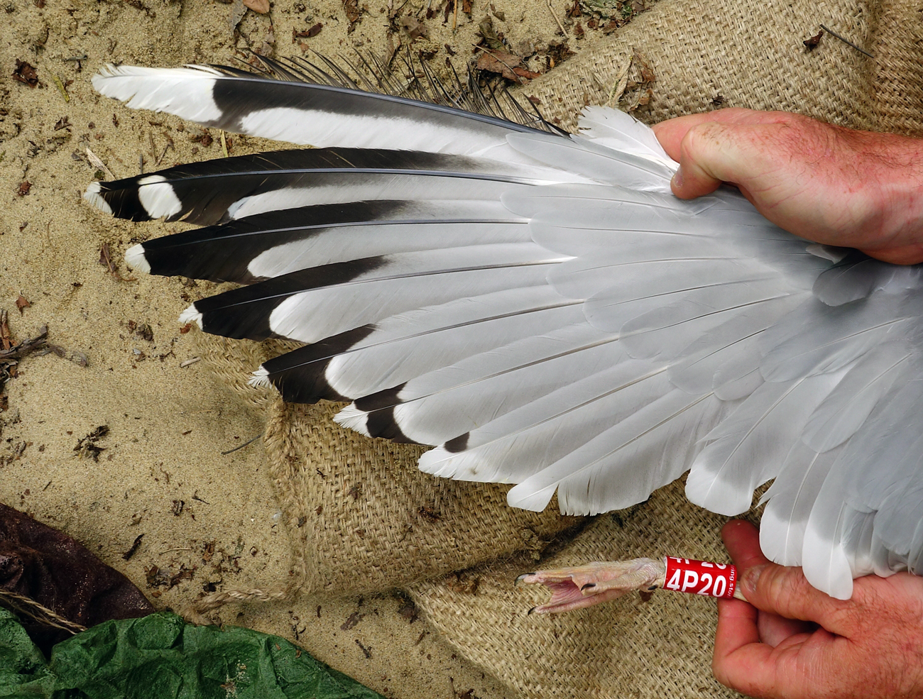 Larus cachinnans 4P20 adult, May 06 2014, Zastów Karczmiski, Poland. Picture: Łukasz Bednarz ringing team. Please visit Łukasz's BLOG for beautiful drawings and up-to-date gull news from eastern Poland: Wildlife art and illustration Location: Zastów Karczmiski, Poland - colony at the banks of the Middle Vistula river. Middle Vistule river is a location where several taxa breed: see composition. Since this is a mixed breeding population where hybridisation is not uncommon, the ringing centre in Poland decided to label birds "Larus argentatus sensu lato". Still bulk of the breeding birds in Middle Vistula region show features of cachinnans. Breeding bird trapped at the nest. Adult, with moderate speckling in iris. Orange-red orbital ring and gape. No red on upper mandible; black on the upper and black on the lower mandible. Pink-fleshy legs.
