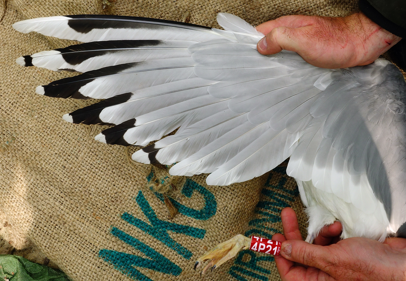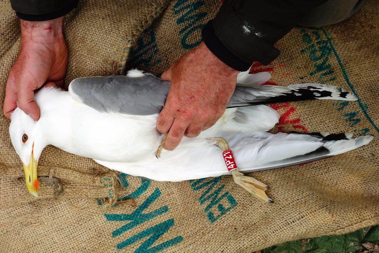 Larus cachinnans 4P21 adult, May 06 2014, Zastów Karczmiski, Poland. Picture: Łukasz Bednarz ringing team. Please visit Łukasz's BLOG for beautiful drawings and up-to-date gull news from eastern Poland: Wildlife art and illustration Location: Zastów Karczmiski, Poland - colony at the banks of the Middle Vistula river. Middle Vistule river is a location where several taxa breed: see composition. Since this is a mixed breeding population where hybridisation is not uncommon, the ringing centre in Poland decided to label birds "Larus argentatus sensu lato". Still bulk of the breeding birds in Middle Vistula region show features of cachinnans. Breeding bird trapped at the nest. Adult, with dense speckling in iris. Orange-red orbital ring and gape. Faint red on upper mandible; no black on the upper and no black on the lower mandible. Yellow legs.