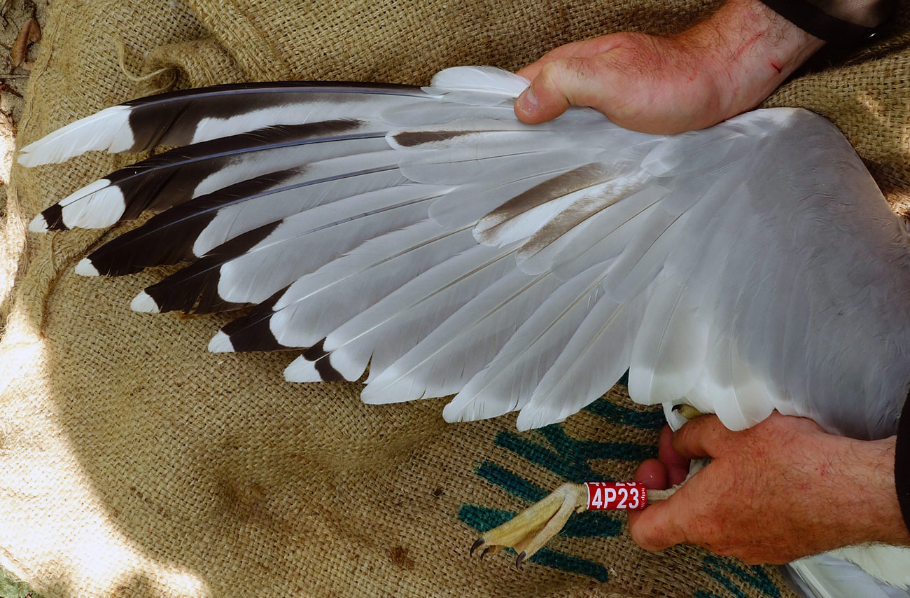 Larus cachinnans 4P23 sub-adult, May 06 2014, Zastów Karczmiski, Poland. Picture: Łukasz Bednarz ringing team. Please visit Łukasz's BLOG for beautiful drawings and up-to-date gull news from eastern Poland: Wildlife art and illustration Location: Zastów Karczmiski, Poland - colony at the banks of the Middle Vistula river. Middle Vistule river is a location where several taxa breed: see composition. Since this is a mixed breeding population where hybridisation is not uncommon, the ringing centre in Poland decided to label birds "Larus argentatus sensu lato". Still bulk of the breeding birds in Middle Vistula region show features of cachinnans. Breeding bird trapped at the nest. Sub-adult, probably 5CY with markings on greater primary coverts.
