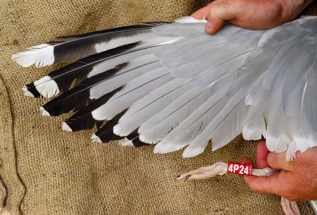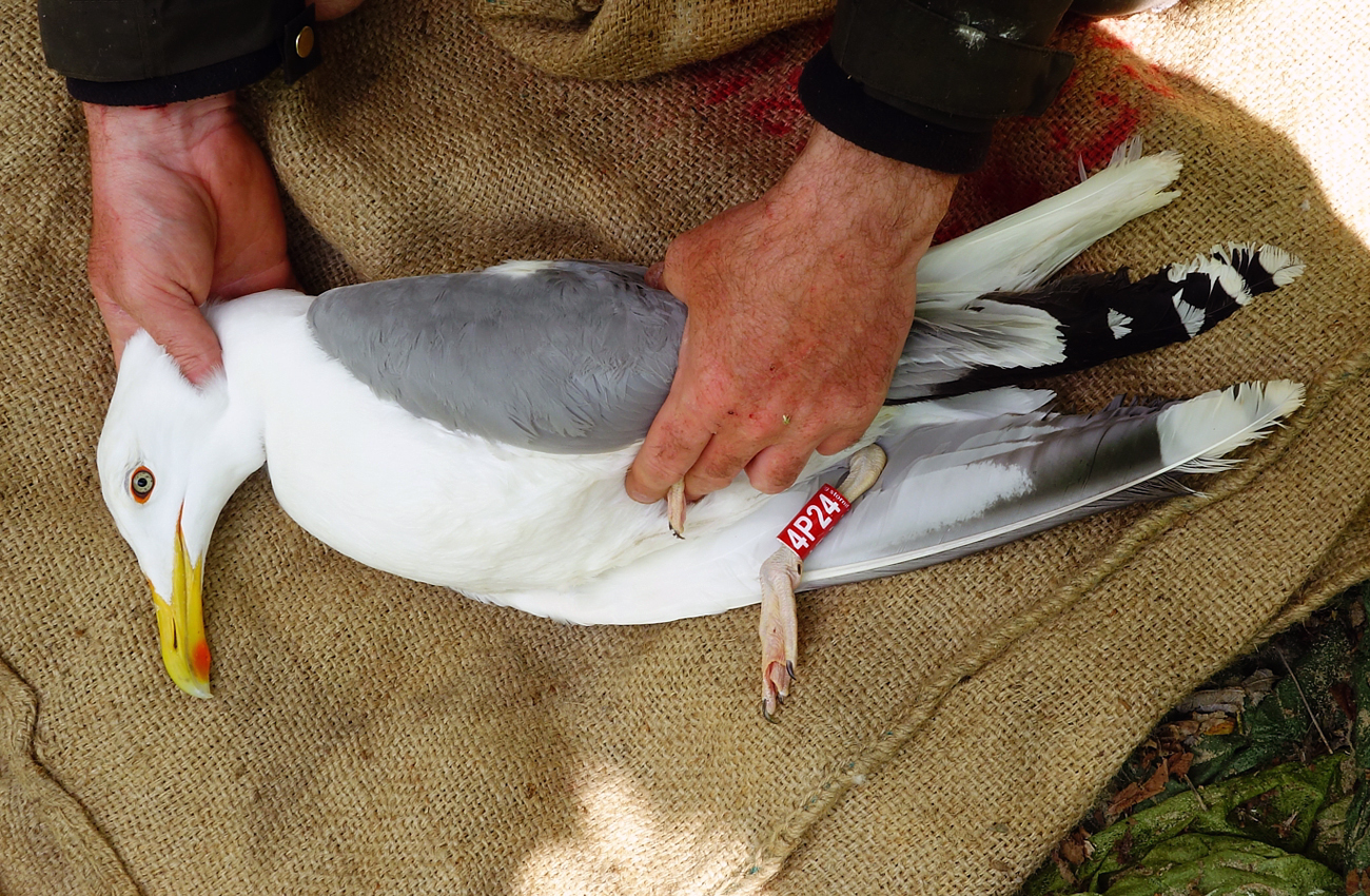 Larus argentatus sensu lato 4P24 adult, May 05 2014, Zastów Karczmiski, Poland. Picture: Łukasz Bednarz ringing team. Please visit Łukasz's BLOG for beautiful drawings and up-to-date gull news from eastern Poland: Wildlife art and illustration Location: Zastów Karczmiski, Poland - colony at the banks of the Middle Vistula river. Middle Vistule river is a location where several taxa breed: see composition. Since this is a mixed breeding population where hybridisation is not uncommon, the ringing centre in Poland decided to label birds "Larus argentatus sensu lato". Still bulk of the breeding birds in Middle Vistula region show features of cachinnans. Breeding bird trapped at the nest, showing little similarity to argentatus (F2?) in obvious gonys, pink legs and medium sized medial band (no deep tongue on P10). All these features can be found in cachinnans as well however.