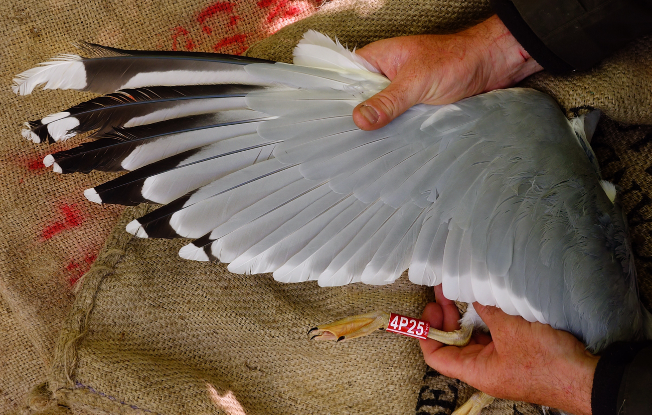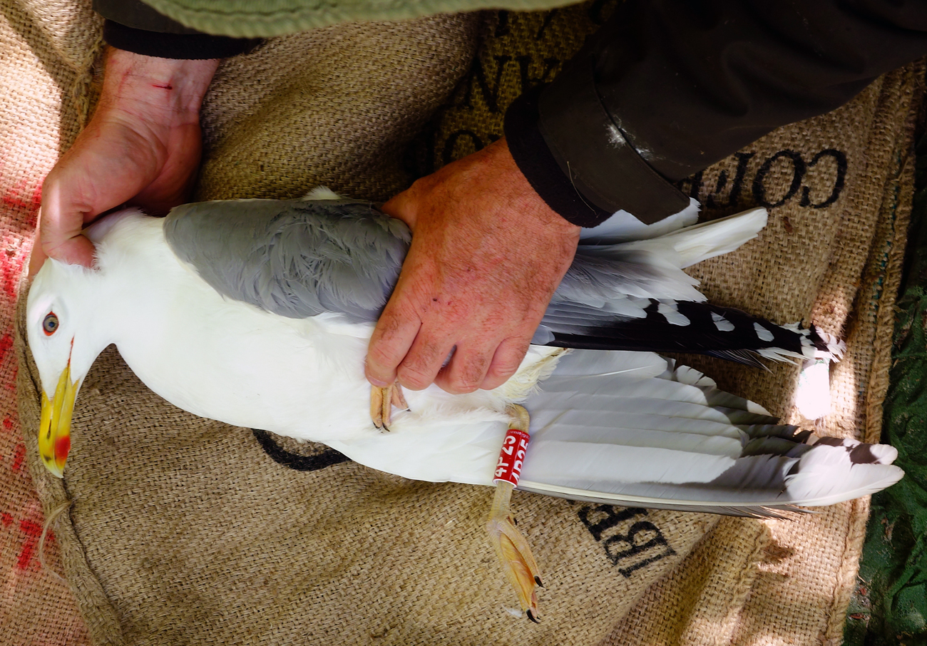 Larus cachinnans 4P25 adult, May 06 2014, Zastów Karczmiski, Poland. Picture: Łukasz Bednarz ringing team. Please visit Łukasz's BLOG for beautiful drawings and up-to-date gull news from eastern Poland: Wildlife art and illustration Location: Zastów Karczmiski, Poland - colony at the banks of the Middle Vistula river. Middle Vistule river is a location where several taxa breed: see composition. Since this is a mixed breeding population where hybridisation is not uncommon, the ringing centre in Poland decided to label birds "Larus argentatus sensu lato". Still bulk of the breeding birds in Middle Vistula region show features of cachinnans. Breeding bird trapped at the nest. Adult, with moderate speckling in iris. Red orbital ring and gape. Faint red on upper mandible; black on the upper and black on the lower mandible. Pale yellow legs.