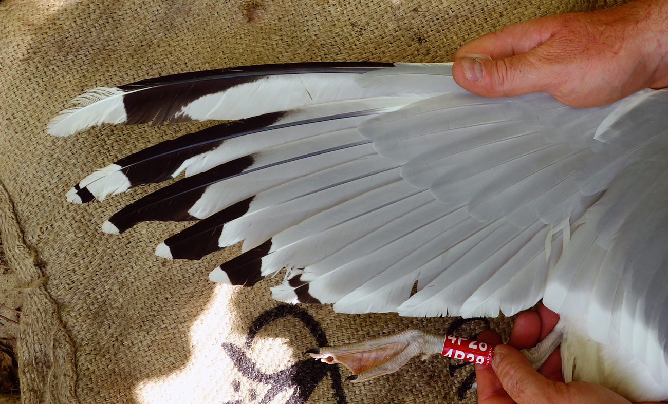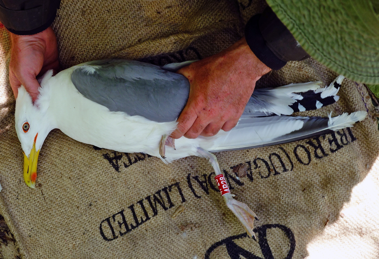 Larus cachinnans 4P28 adult, May 06 2014, Zastów Karczmiski, Poland. Picture: Łukasz Bednarz ringing team. Please visit Łukasz's BLOG for beautiful drawings and up-to-date gull news from eastern Poland: Wildlife art and illustration Location: Zastów Karczmiski, Poland - colony at the banks of the Middle Vistula river. Middle Vistule river is a location where several taxa breed: see composition. Since this is a mixed breeding population where hybridisation is not uncommon, the ringing centre in Poland decided to label birds "Larus argentatus sensu lato". Still bulk of the breeding birds in Middle Vistula region show features of cachinnans. Breeding bird trapped at the nest. Adult, with moderate speckling in iris. Red orbital ring and gape. No red on upper mandible; black on the upper and black on the lower mandible. Pink legs.
