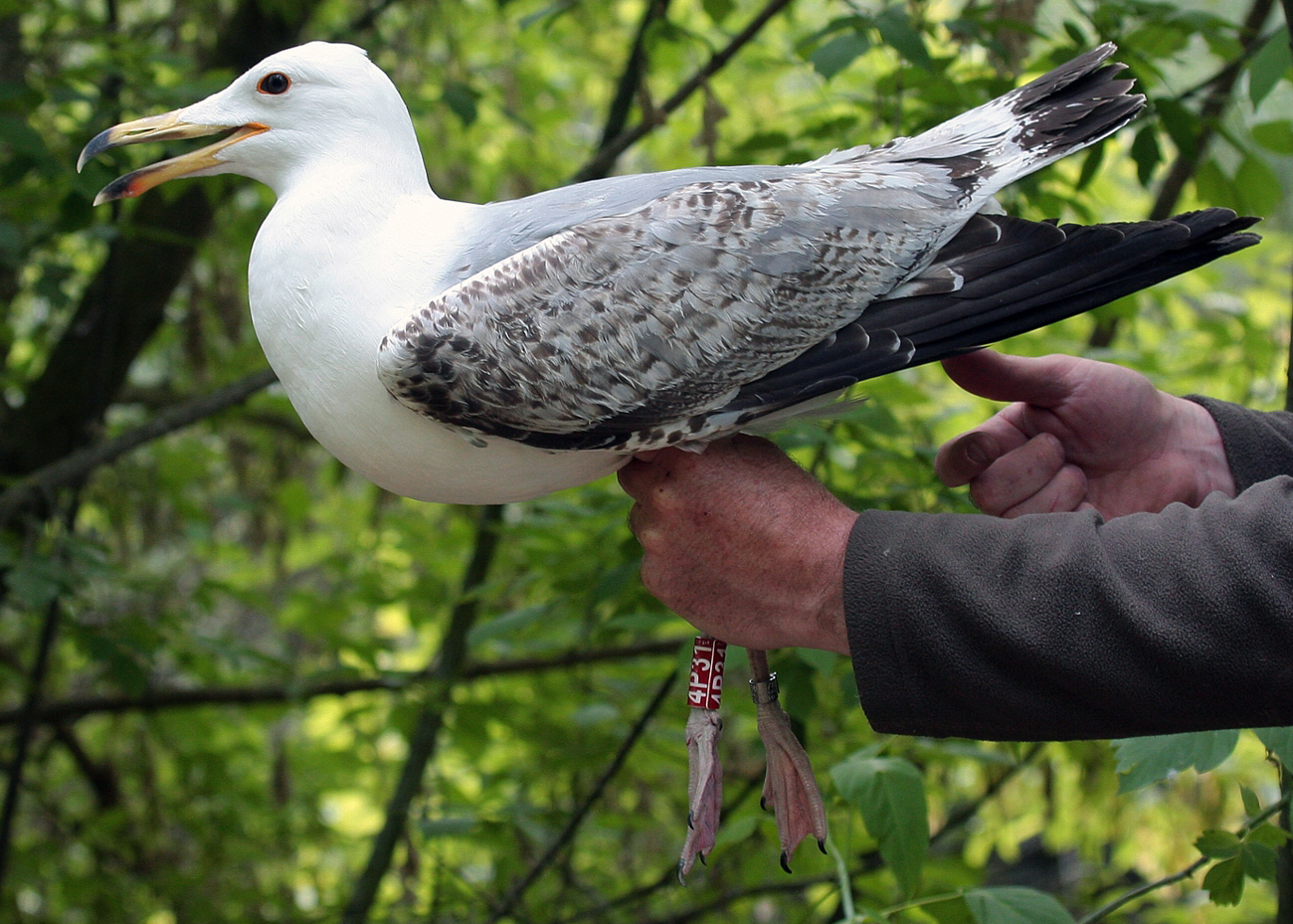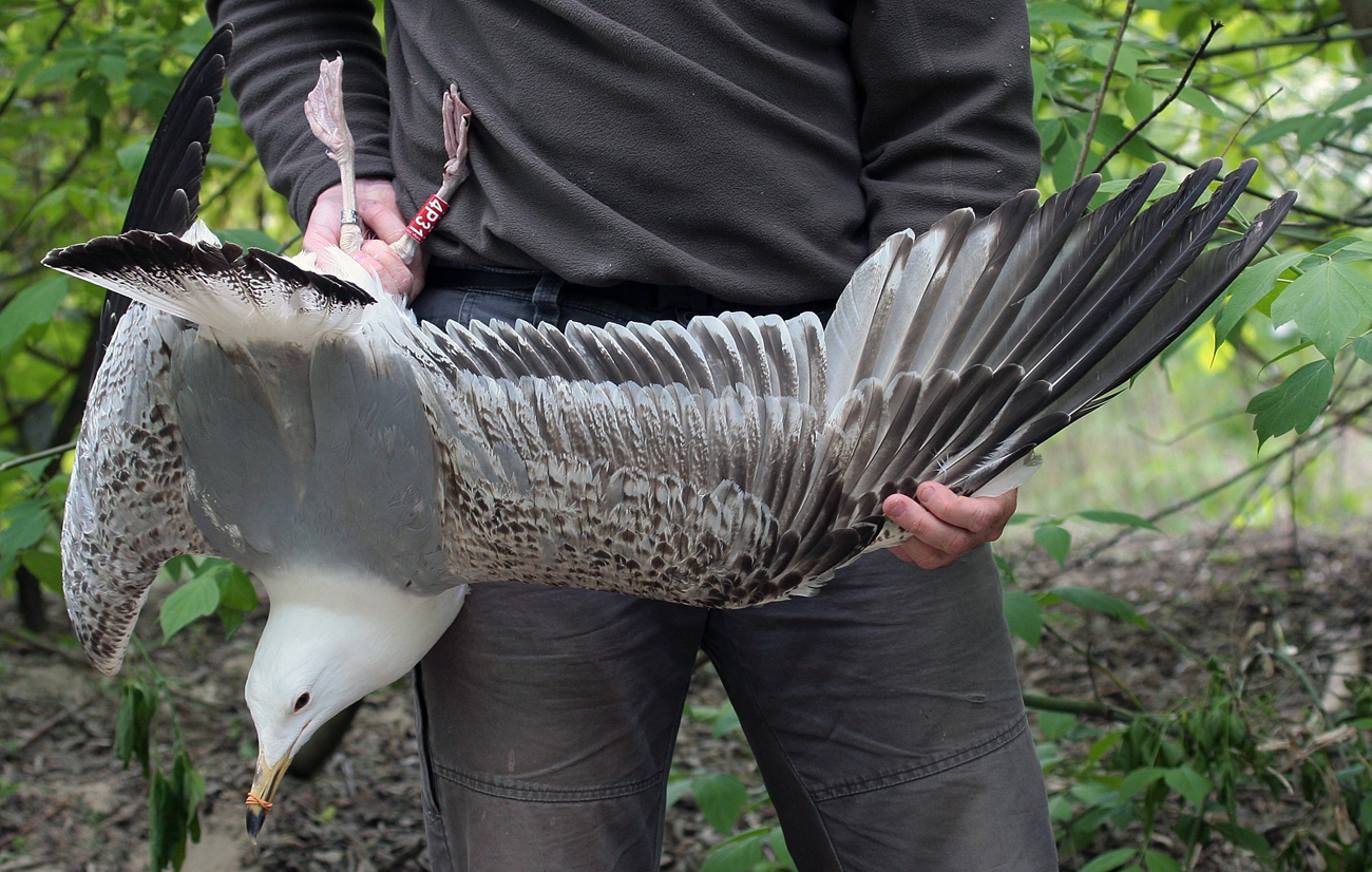 Larus cachinnans 4P31 3CY, May 06 2014, Zastów Karczmiski, Poland. Picture: Łukasz Bednarz ringing team. Location: Zastów Karczmiski, Poland - colony at the banks of the Middle Vistula river. Middle Vistule river is a location where several taxa breed: see composition. Since this is a mixed breeding population where hybridisation is not uncommon, the ringing centre in Poland decided to label birds "Larus argentatus sensu lato". Still bulk of the breeding birds in Middle Vistula region show features of cachinnans. Breeding bird trapped at the nest. Sub-adult, with obvious immature markings on many coverts and flight feathers, 3CY.