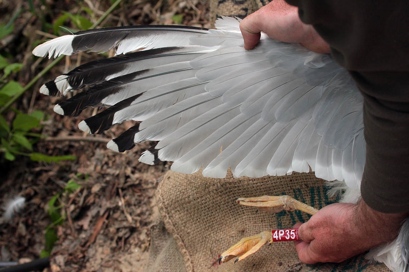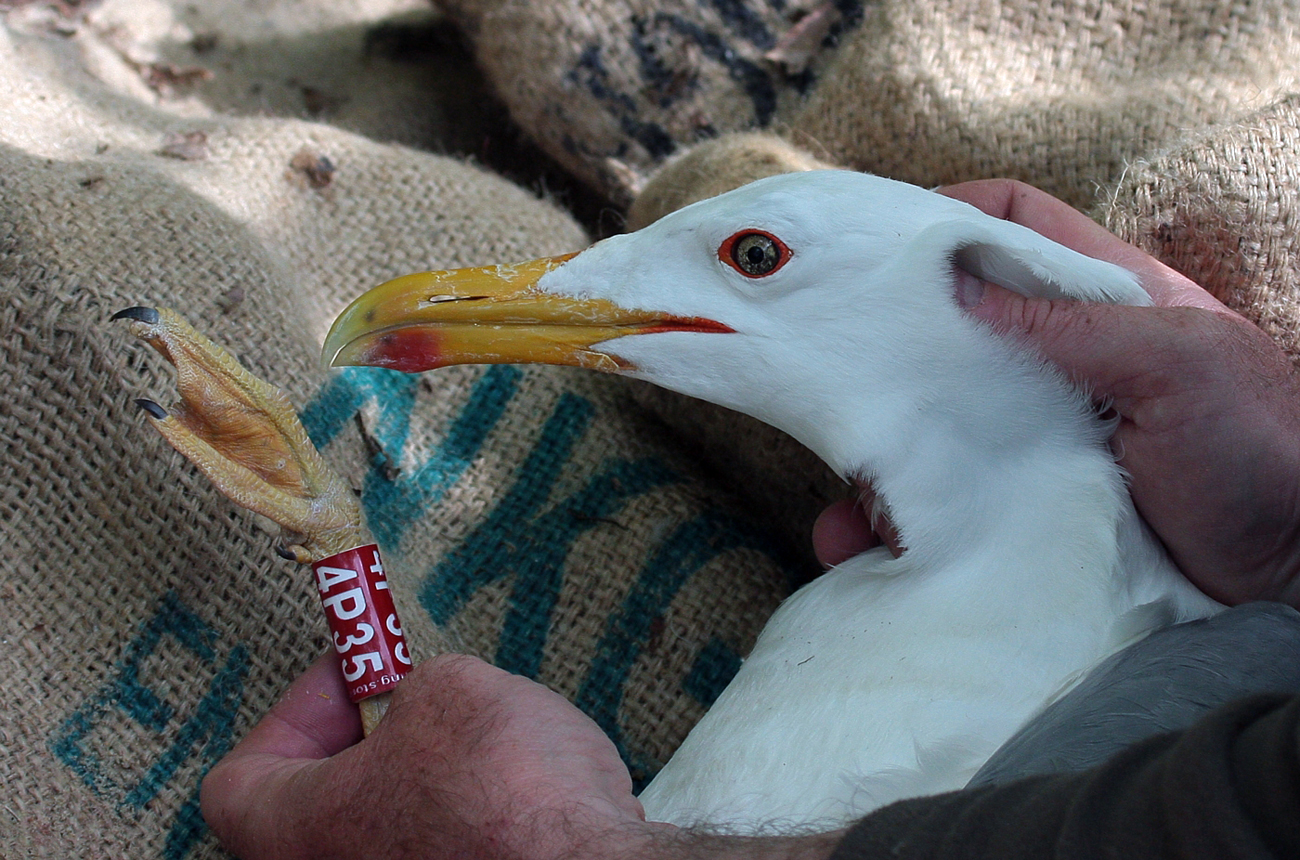 Larus cachinnans 4P35 adult, May 06 2014, Zastów Karczmiski, Poland. Picture: Łukasz Bednarz ringing team. Location: Zastów Karczmiski, Poland - colony at the banks of the Middle Vistula river. Middle Vistule river is a location where several taxa breed: see composition. Since this is a mixed breeding population where hybridisation is not uncommon, the ringing centre in Poland decided to label birds "Larus argentatus sensu lato". Still bulk of the breeding birds in Middle Vistula region show features of cachinnans. Breeding bird trapped at the nest, with high bill and rich yellow legs. Probably within limits for (male) cachinnans. Adult, with dense speckling in iris. Red orbital ring and gape. Faint red on upper mandible; black on the upper and black on the lower mandible. Yellow legs.