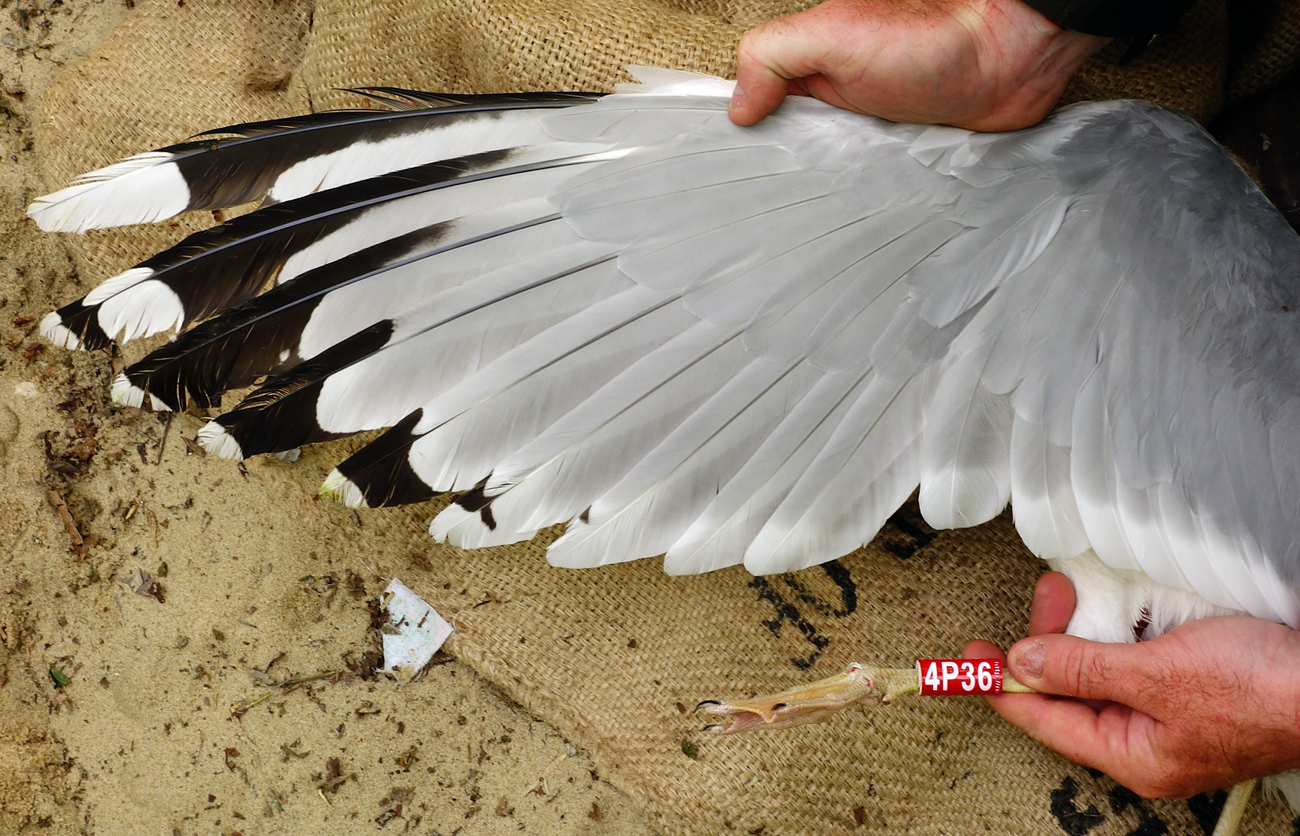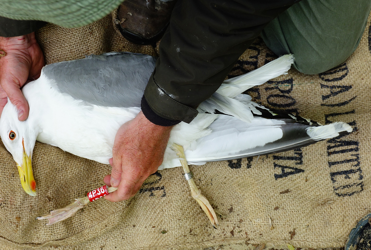 Larus cachinnans 4P36 adult, May 06 2014, Zastów Karczmiski, Poland. Picture: Łukasz Bednarz ringing team. Location: Zastów Karczmiski, Poland - colony at the banks of the Middle Vistula river. Middle Vistule river is a location where several taxa breed: see composition. Since this is a mixed breeding population where hybridisation is not uncommon, the ringing centre in Poland decided to label birds "Larus argentatus sensu lato". Still bulk of the breeding birds in Middle Vistula region show features of cachinnans. Breeding bird trapped at the nest; bird with obvious gonys angle. Adult, with moderate speckling in iris. Orange-red orbital ring and gape. No red on upper mandible; black on the upper and black on the lower mandible. Yellow legs.