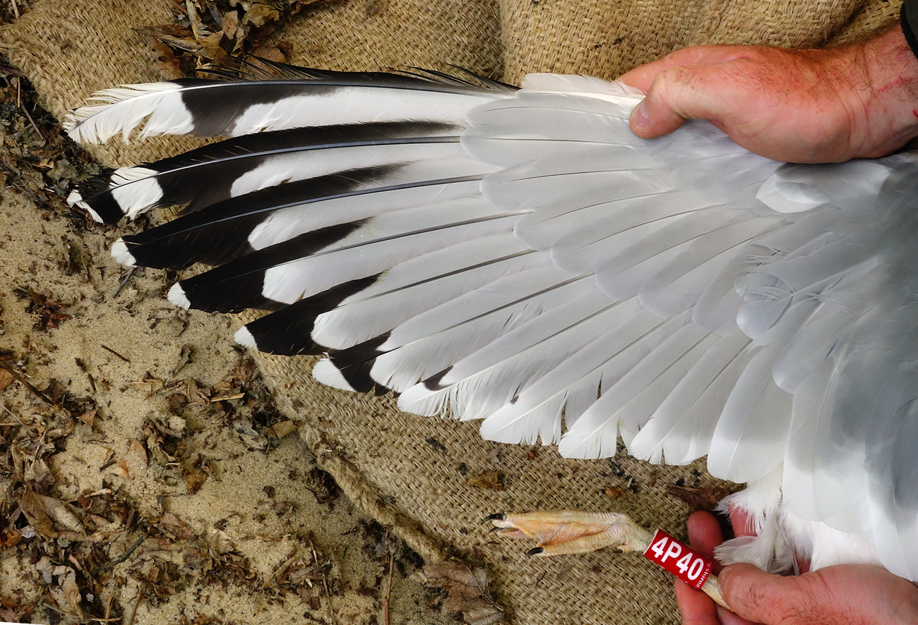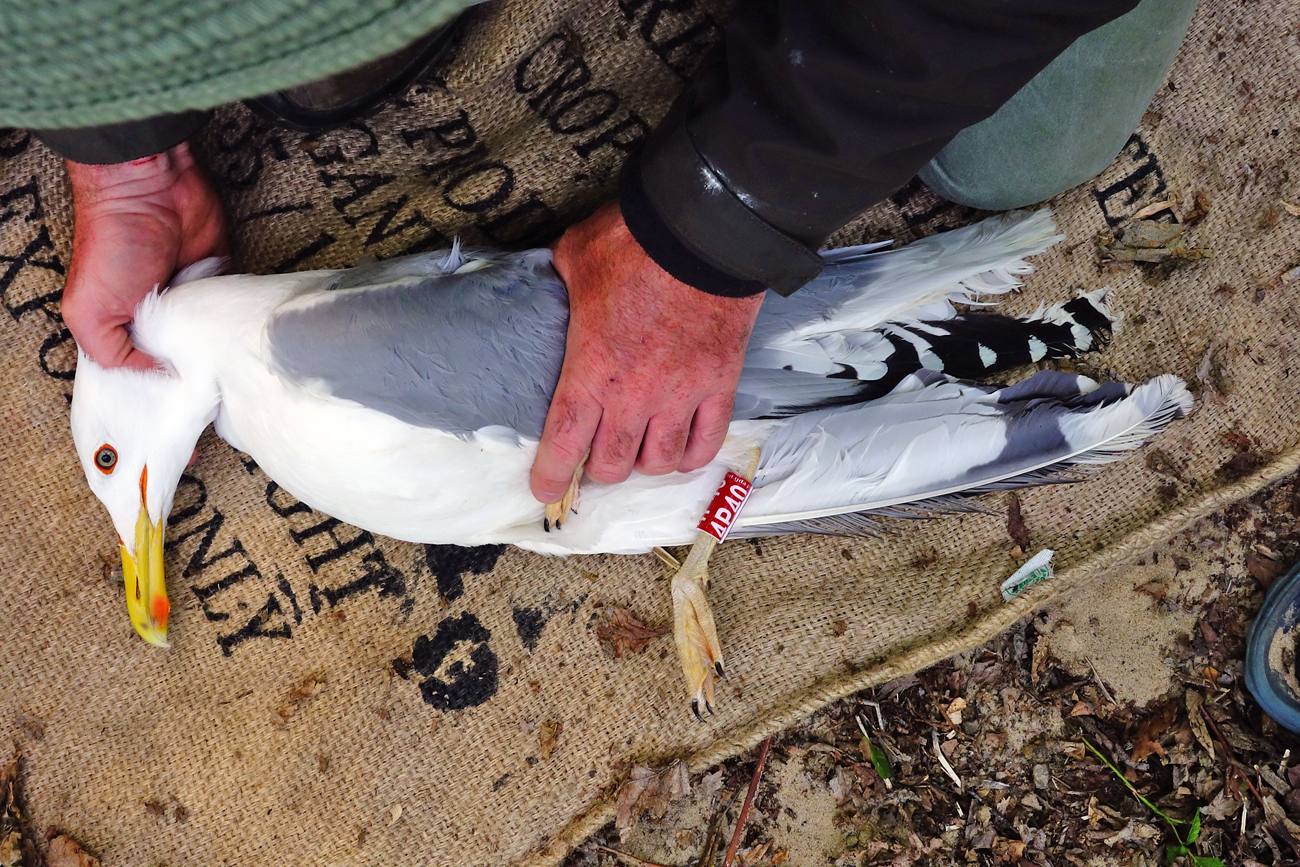 Larus cachinnans 4P40 adult, May 07 2014, Zastów Karczmiski, Poland. Picture: Łukasz Bednarz ringing team. Location: Zastów Karczmiski, Poland - colony at the banks of the Middle Vistula river. Middle Vistule river is a location where several taxa breed: see composition. Since this is a mixed breeding population where hybridisation is not uncommon, the ringing centre in Poland decided to label birds "Larus argentatus sensu lato". Still bulk of the breeding birds in Middle Vistula region show features of cachinnans. Breeding bird trapped at the nest. Adult, with clouded speckling in iris. Red orbital ring and gape. No red on upper mandible; black on the upper and black on the lower mandible. Yellow legs.