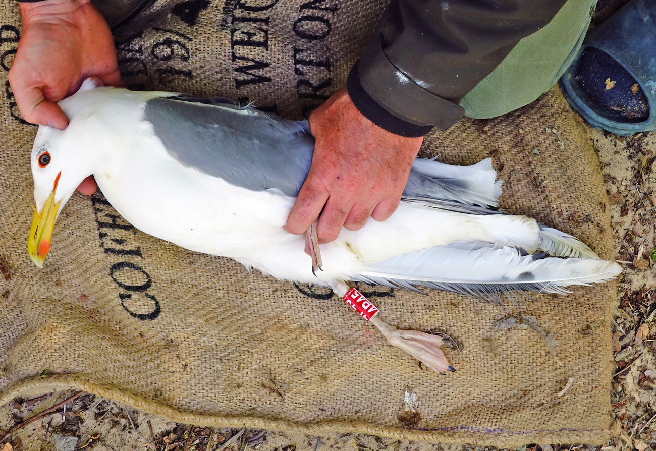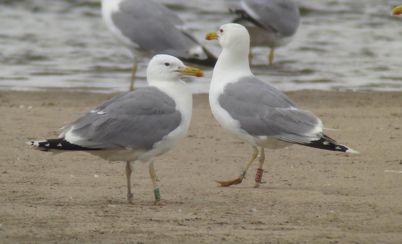 Larus cachinnans 4P45 adult, May-July 2014, Zastów Karczmiski & December 27 2014, Witoszowka Reservoir, Poland. Picture: M. Dabek & Łukasz Bednarz ringing team. Location: Zastów Karczmiski, Poland - colony at the banks of the Middle Vistula river. Middle Vistule river is a location where several taxa breed: see composition. Since this is a mixed breeding population where hybridisation is not uncommon, the ringing centre in Poland decided to label birds "Larus argentatus sensu lato". Still bulk of the breeding birds in Middle Vistula region show features of cachinnans. below: Larus cachinnans 4P45 adult, May 07 2014, Zastów Karczmiski, Poland. Picture: Łukasz Bednarz ringing team. Breeding bird trapped at the nest. Adult, with dense speckling in iris. Red orbital ring and gape. No red on upper mandible; black on the upper and black on the lower mandible. Pale yellow legs.