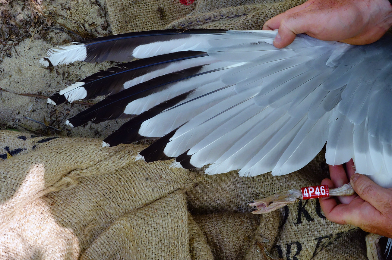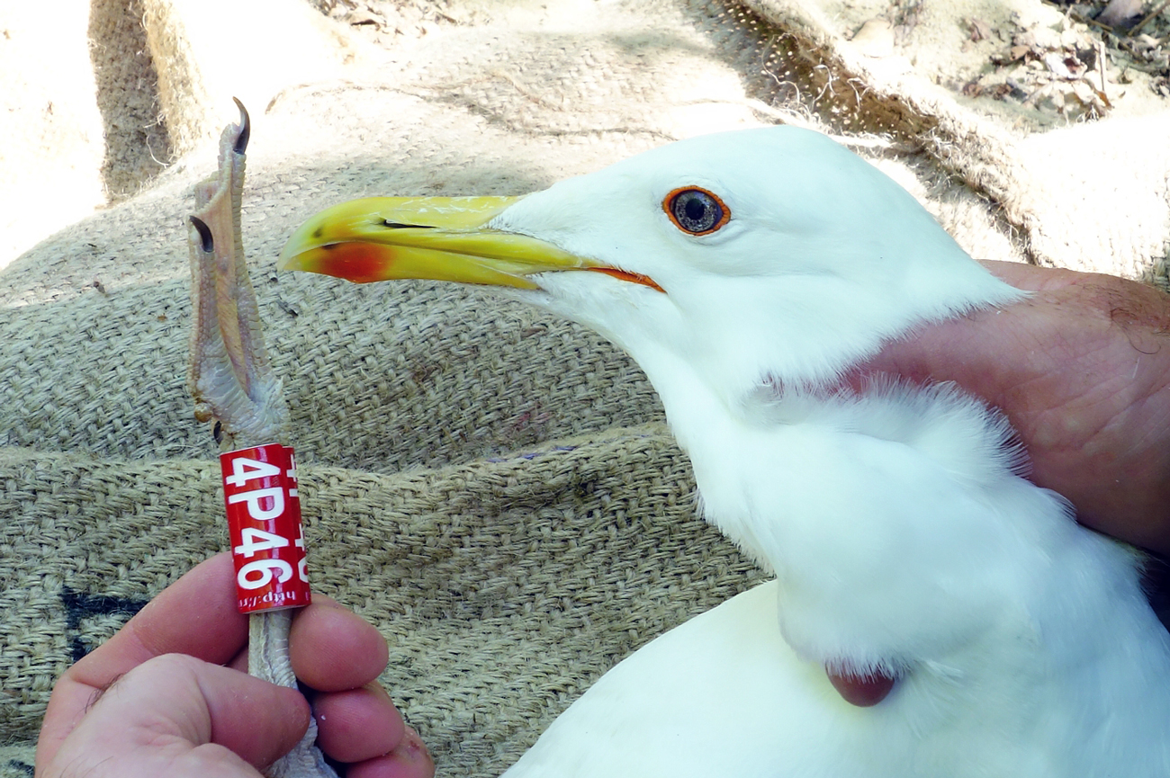 Larus cachinnans 4P46 adult, May 07 2014, Zastów Karczmiski, Poland. Picture: Łukasz Bednarz ringing team. Location: Zastów Karczmiski, Poland - colony at the banks of the Middle Vistula river. Middle Vistule river is a location where several taxa breed: see composition. Since this is a mixed breeding population where hybridisation is not uncommon, the ringing centre in Poland decided to label birds "Larus argentatus sensu lato". Still bulk of the breeding birds in Middle Vistula region show features of cachinnans. Breeding bird trapped at the nest, with a hint of black on primary coverts, hence maybe a younger adult.