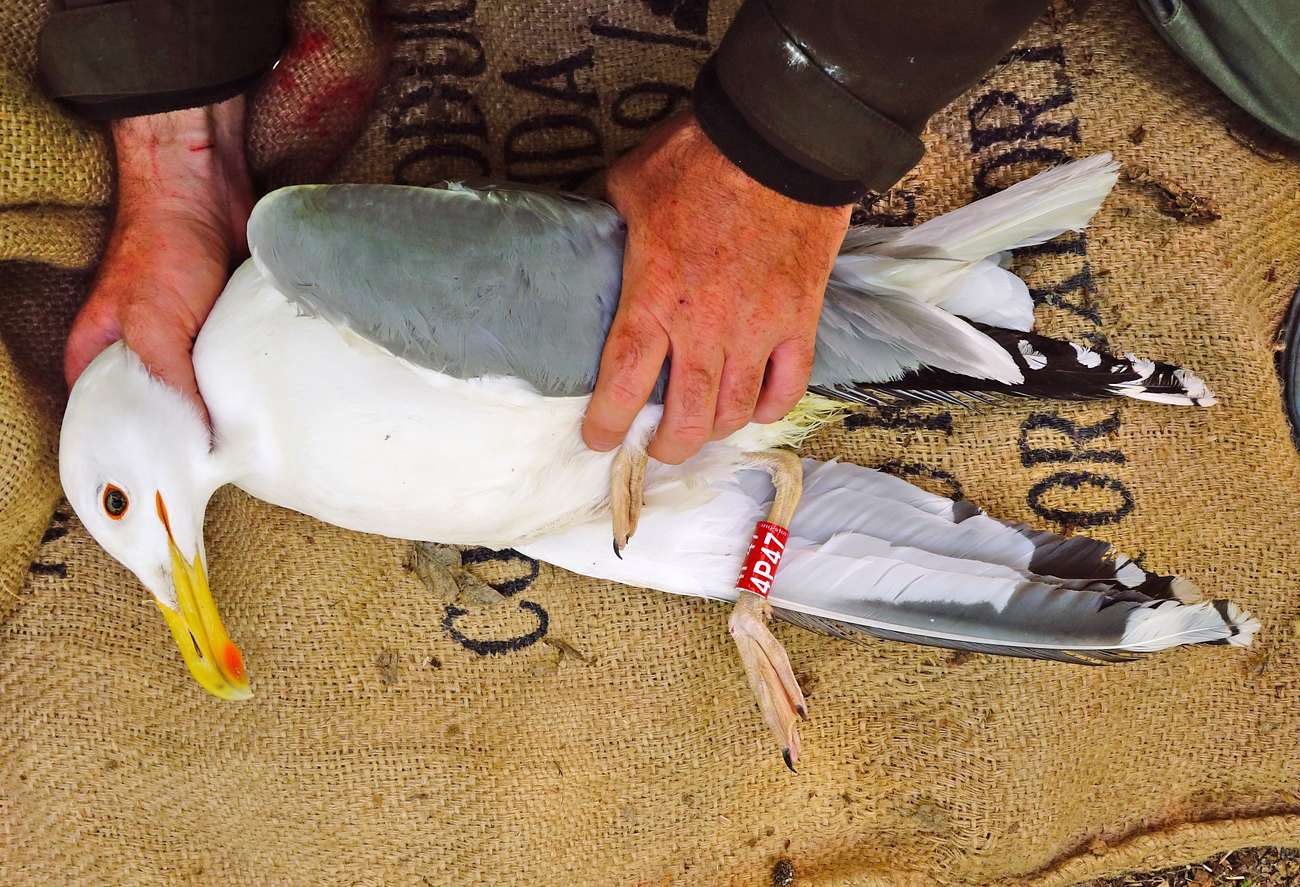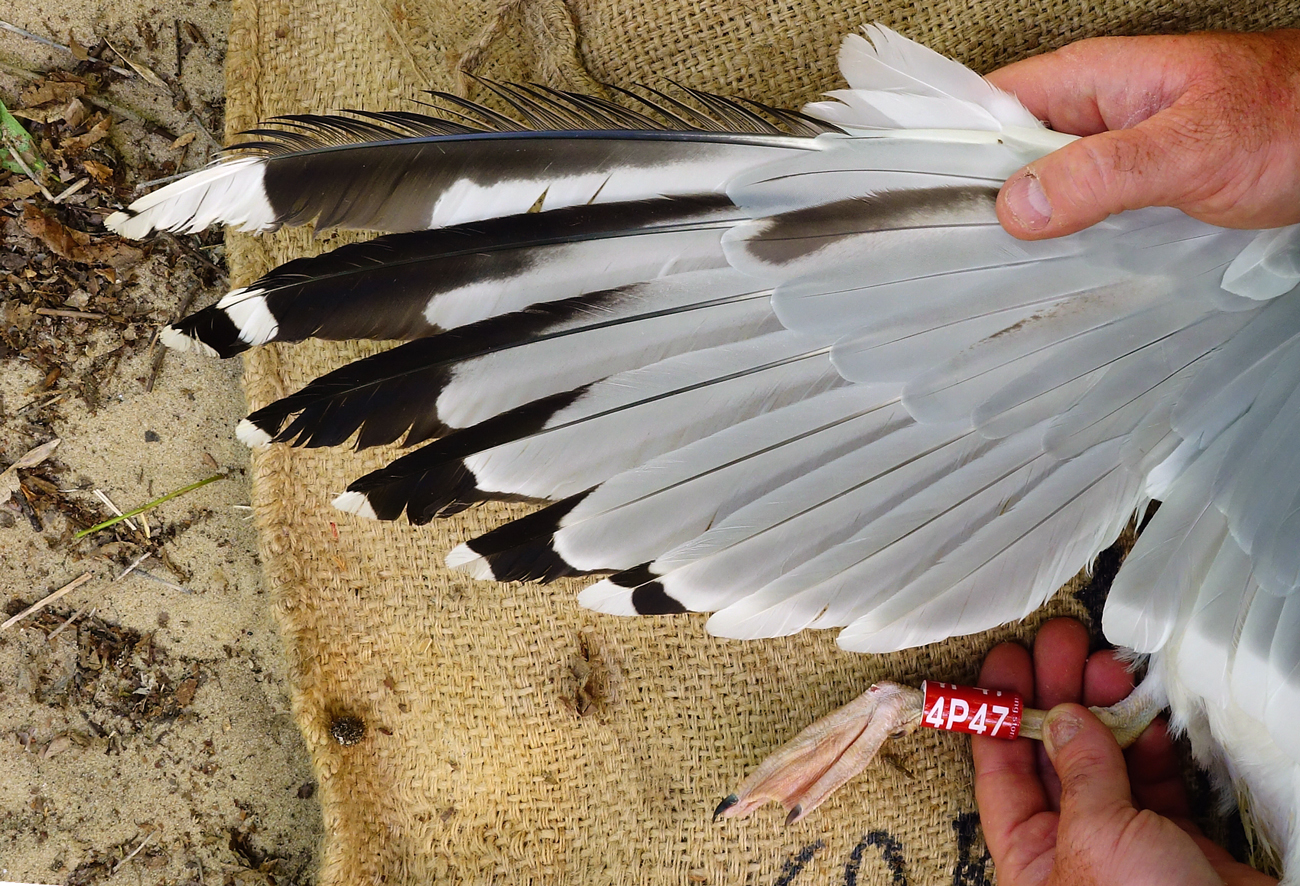 Larus cachinnans 4P47 sub-adult, May 07 2014, Zastów Karczmiski, Poland. Picture: Łukasz Bednarz ringing team. Location: Zastów Karczmiski, Poland - colony at the banks of the Middle Vistula river. Middle Vistule river is a location where several taxa breed: see composition. Since this is a mixed breeding population where hybridisation is not uncommon, the ringing centre in Poland decided to label birds "Larus argentatus sensu lato". Still bulk of the breeding birds in Middle Vistula region show features of cachinnans. Breeding bird trapped at the nest. Sub-adult, with obvious dark centra on primary coverts.