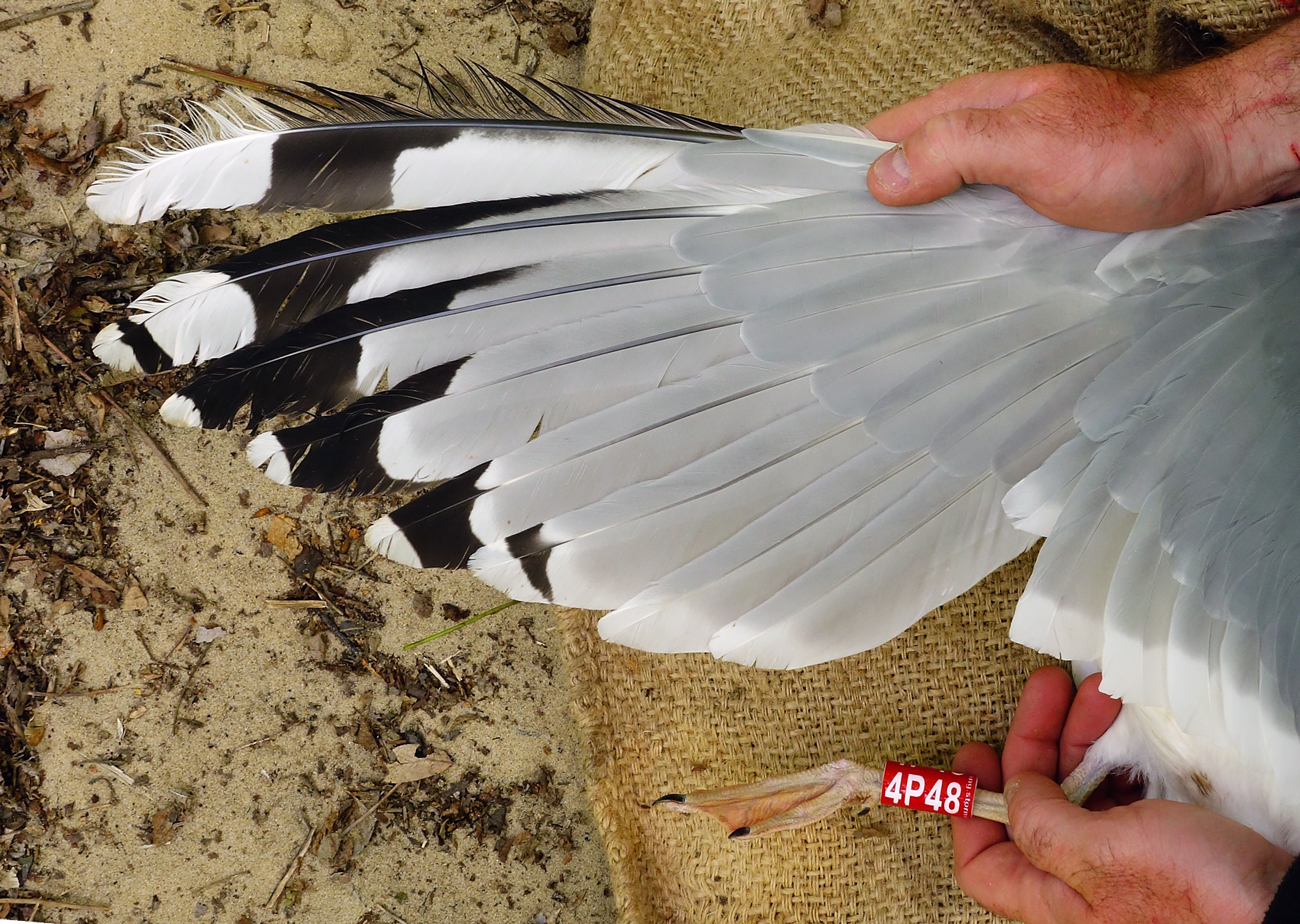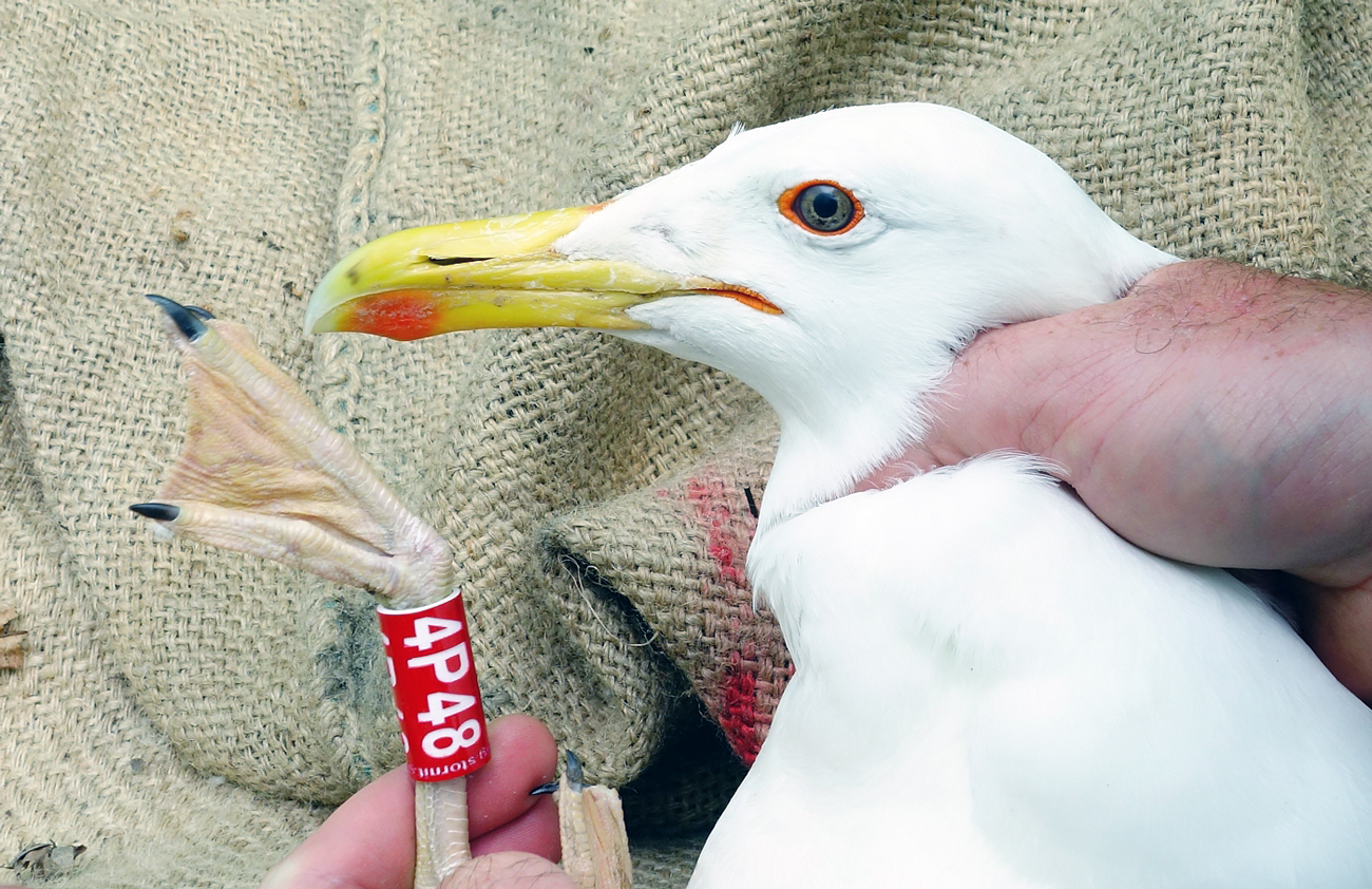 Larus cachinnans 4P48 adult, May 07 2014, Zastów Karczmiski, Poland. Picture: Łukasz Bednarz ringing team. Location: Zastów Karczmiski, Poland - colony at the banks of the Middle Vistula river. Middle Vistule river is a location where several taxa breed: see composition. Since this is a mixed breeding population where hybridisation is not uncommon, the ringing centre in Poland decided to label birds "Larus argentatus sensu lato". Still bulk of the breeding birds in Middle Vistula region show features of cachinnans. Breeding bird trapped at the nest; bird with obvious gonys angle. Adult, with dense speckling in iris. Red orbital ring and gape. No red on upper mandible; black on the upper and no black on the lower mandible. Yellow legs.