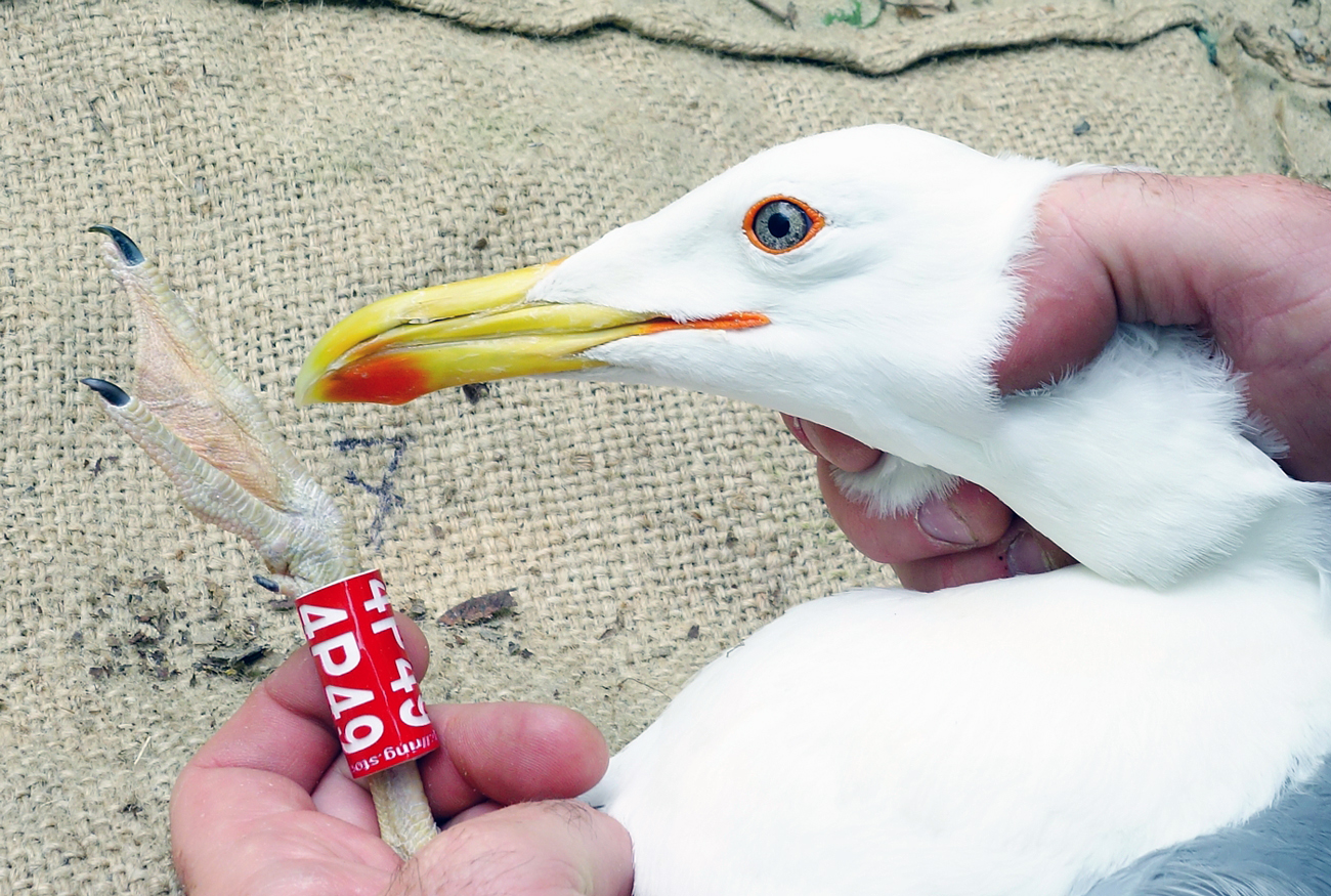 Larus cachinnans 4P49 adult, May 07 2014, Zastów Karczmiski, Poland. Picture: Łukasz Bednarz ringing team. Location: Zastów Karczmiski, Poland - colony at the banks of the Middle Vistula river. Middle Vistule river is a location where several taxa breed: see composition. Since this is a mixed breeding population where hybridisation is not uncommon, the ringing centre in Poland decided to label birds "Larus argentatus sensu lato". Still bulk of the breeding birds in Middle Vistula region show features of cachinnans. Breeding bird trapped at the nest. Adult, with dense speckling in iris. Red orbital ring and gape. Red on upper mandible; no black on the upper and some black on the lower mandible. Yellow legs.
