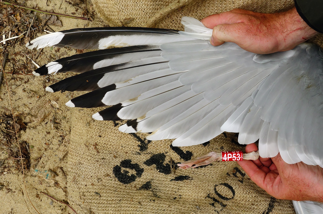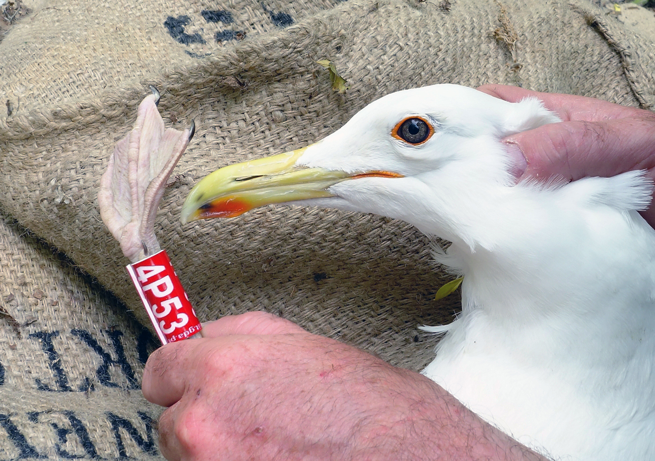 Larus cachinnans 4P53 adult, May 08 2014, Zastów Karczmiski, Poland. Picture: Łukasz Bednarz ringing team. Location: Zastów Karczmiski, Poland - colony at the banks of the Middle Vistula river. Middle Vistule river is a location where several taxa breed: see composition. Since this is a mixed breeding population where hybridisation is not uncommon, the ringing centre in Poland decided to label birds "Larus argentatus sensu lato". Still bulk of the breeding birds in Middle Vistula region show features of cachinnans. Breeding bird trapped at the nest. Adult, with dense speckling in iris. Orange-red orbital ring and gape. No red on upper mandible; black on the upper and black on the lower mandible. Pink-fleshy legs.