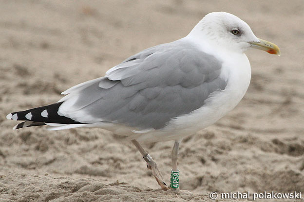 Larus cachinnans 8CY 4P58 October 07 2011, Katy Rybackie, Poland. Picture: Michal Polakowski. Caspian Gull, green 4P58. Bird ringed as pullus on May 09 2004 at Wisla Wloclawek Tama, Poland. Bird from a mixed colony, parentage unknown. In some ways this bird shows intermediacy. Its bill is easily within the range of Caspian, but in adult plumage it has a Herring Gull-like pale eye and angular head. However, as P10 is not fully grown yet, there remains much room for speculation. In general, maybe just within the limits for cachinnans. |
