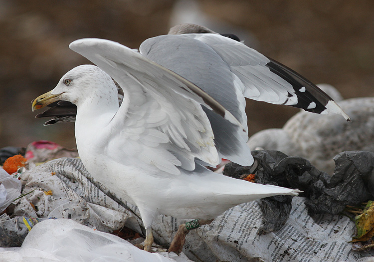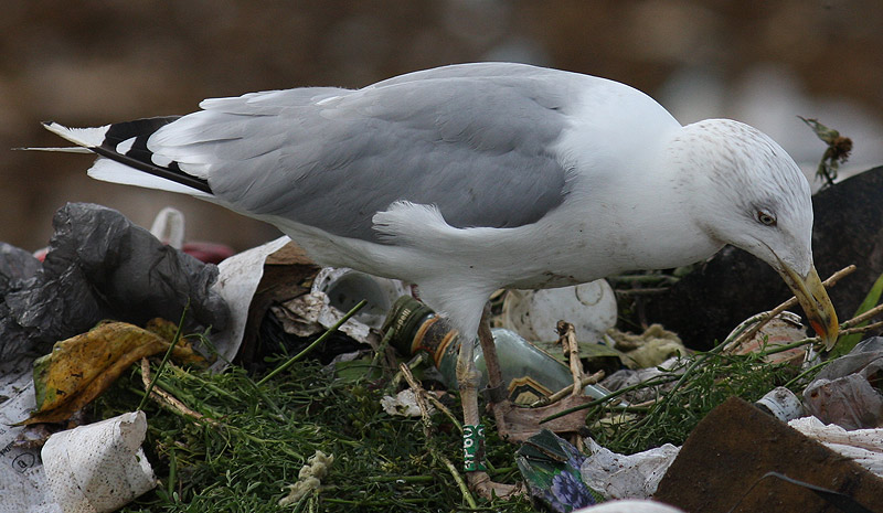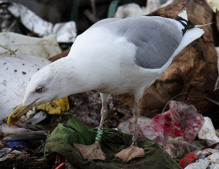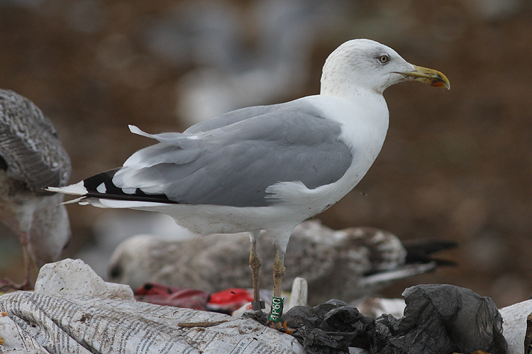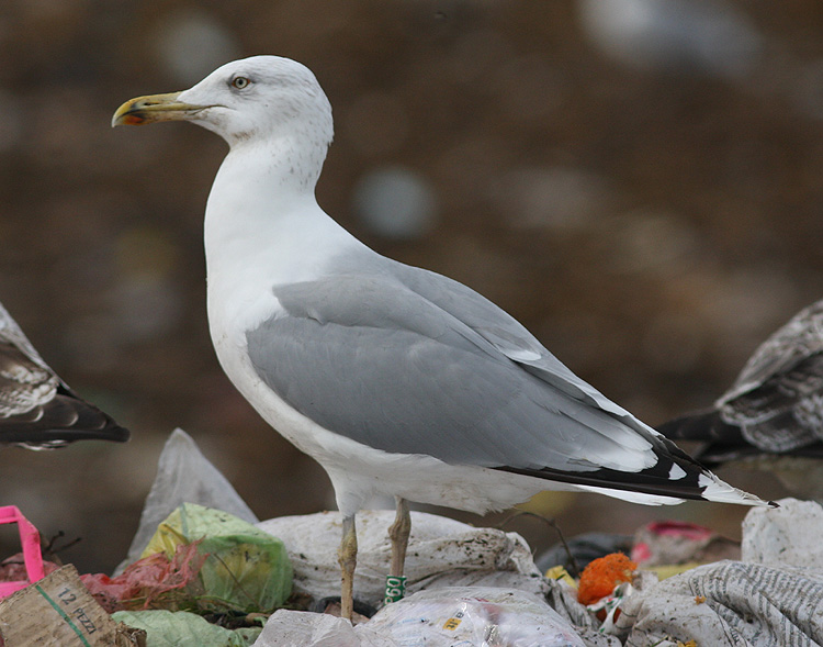 Larus cachinnans hybrid 2CY, 5CY & 7CY 4P60 June 2005 UK, September 2008 Lithuania, January 2010 Austria. Hybrid Caspian x Herring Gull, green 4P60. Bird ringed as pullus on May 09 2004 at Wisla Wloclawek Tama, Poland. Bird from a mixed colony. Mother known as Caspian, father as Herring Gull. Ringed as a chick in the Wloclawek colony, Poland, May 09 2004. In many ways this bird shows classic intermediacy. Its bill is easily within the range of Caspian, but in adult plumage it has a Herring Gull-like pale eye and P10 pattern (more black than white). Its legs are yellow-toned, but this is of no real consequence. below: 2CY 4P60 June 05 2005, Cambridge, UK. Picture: Dick Newell. Bird in active complete moult, P7-P10 still old.