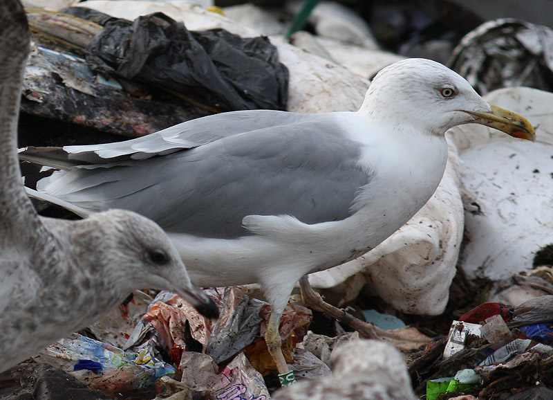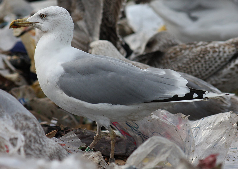 below: 5CY 4P60 September 10 2008, Dumpiai dump Klaipeda Caly Obszar, Lithuania. Picture: Hannu Koskinen & Visa Rauste. Bird in active complete moult, P7 fully grown, P10 still old. Active moult in central greater coverts and outermost secondaries. Note plain grey greater primary coverts as indication for adult plumage. Pale yellow iris, streaking all over the head, darker mask around the eye indicate hybrid. White tongue on P10 not square ended, instead tappering as in many argentatus.