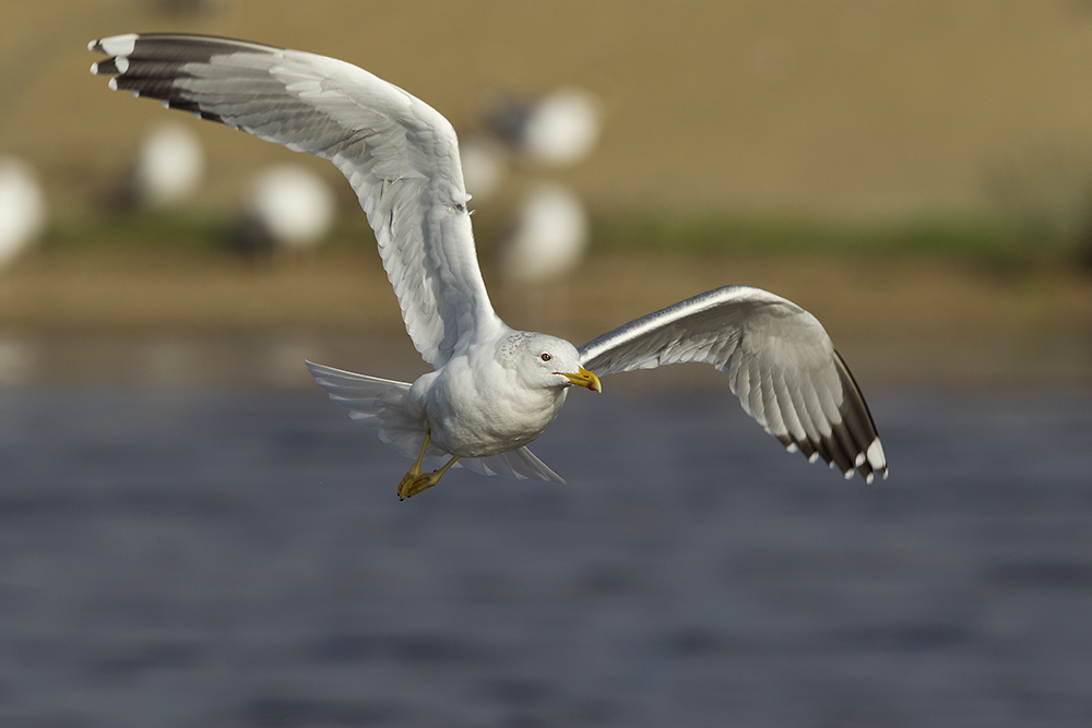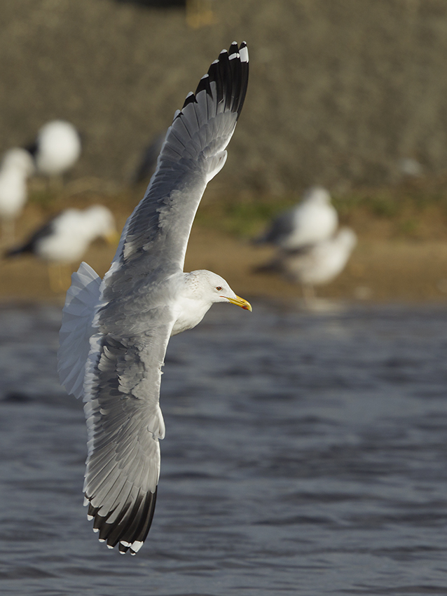 Larus cachinnans? adult, December 21 2012, Ashdod, Israel. Picture: Amir Ben Dov. Probably eastern cachinnans or barabensis (~intergrade): obvious pale tongue on underside of P10 only reaching halfway down the feather. Therefore, more black than white in P10 (medial band much broader than white tip). Also full broad subterminal band on P10 very rare in western cachinnans. Relatively small mirror on P9. Broad band on P5 and complete black band on P4. Pale iris. |