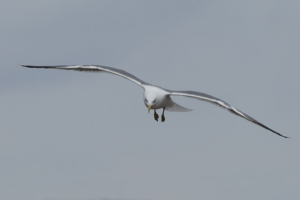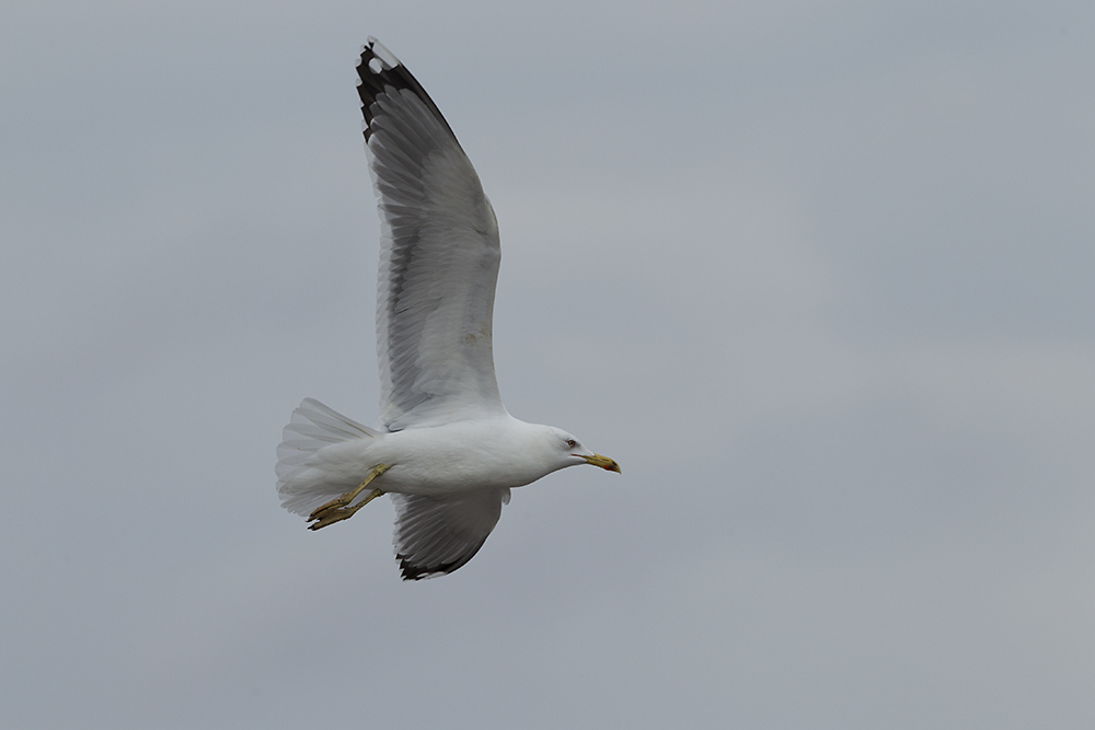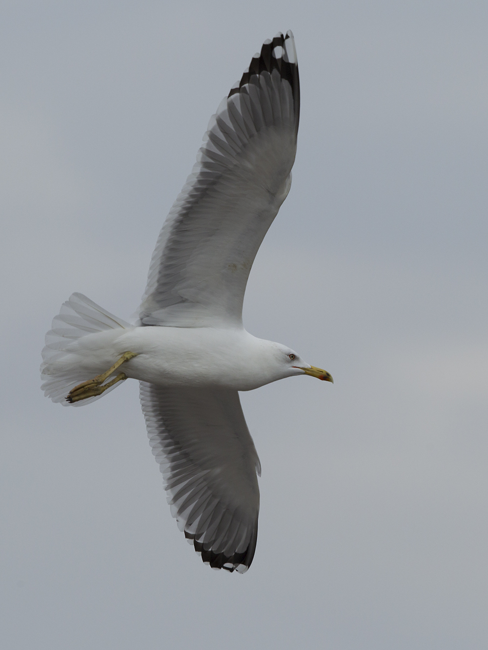 Larus cachinnans adult, January 05 2013, Ashdod, Israel. Picture: Amir Ben Dov. Obvious deep pale tongue on underside of P10. Less black than white in P10 (medial band not as broad as white tip). Broken subterminal band on P10. Broad band on P5 and no black on P4. Pale iris and hint of gonys angle gives it a michahellis look. |