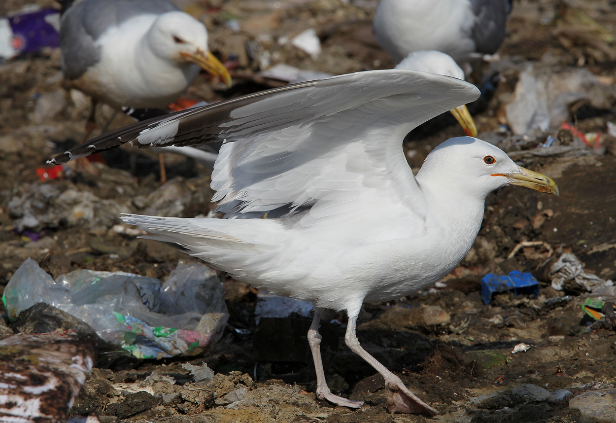Larus cachinnans adult, June 28 2012, Baku landfill, Azerbaijan. Picture: Chris Gibbins. Long grey tongue on underside of P10, that curves back at the edge. Full sub-terminal band on P10. For cachinnans, broad medial band on P10. (see also this bird) |