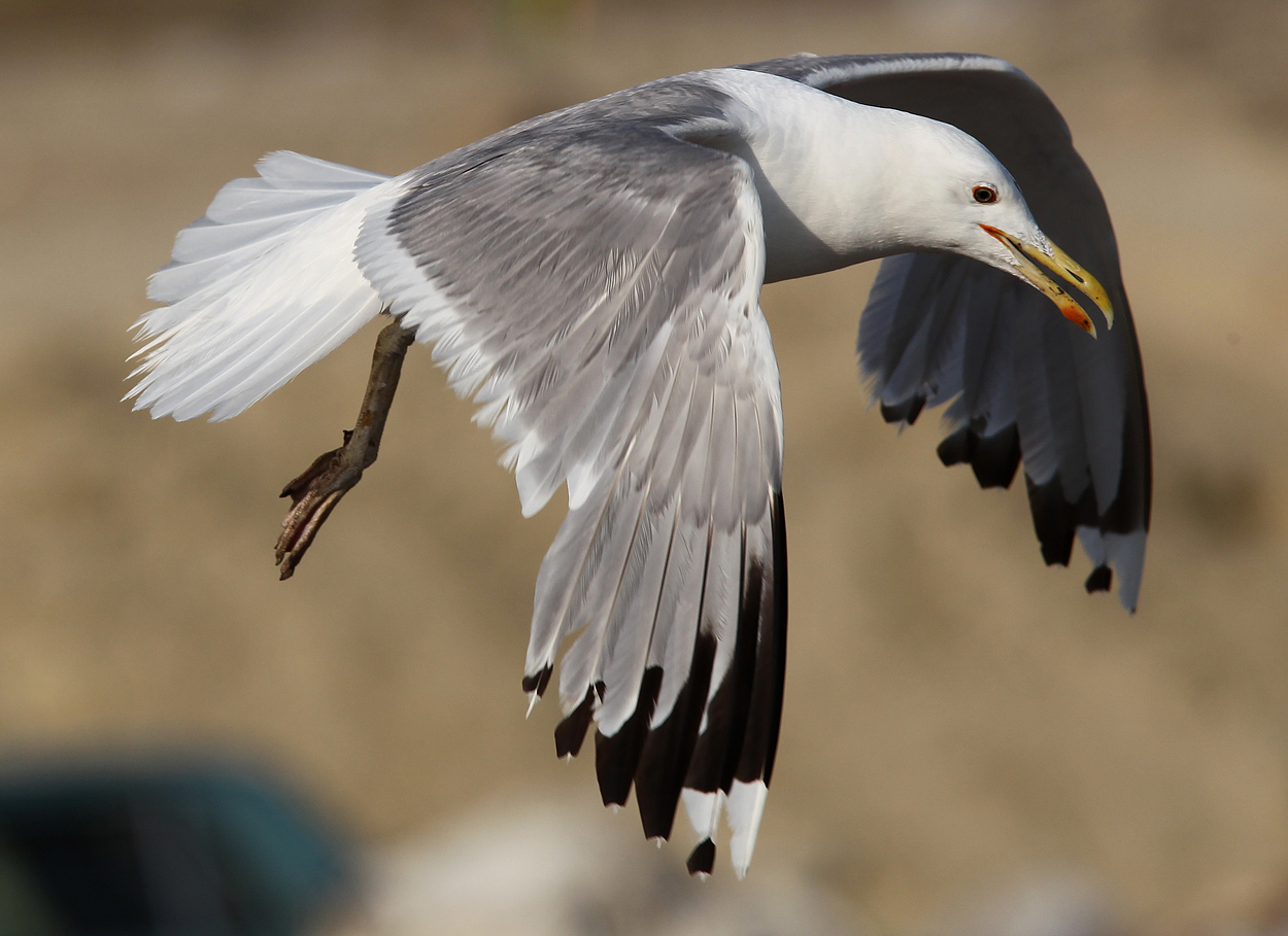 Larus cachinnans adult, June 28 2012, Baku landfill, Azerbaijan. Picture: Chris Gibbins. Long pale tongue on underside of P10, leaving only very narrow medial band (nonetheless, small black sub-terminal spot on outerweb P10). |