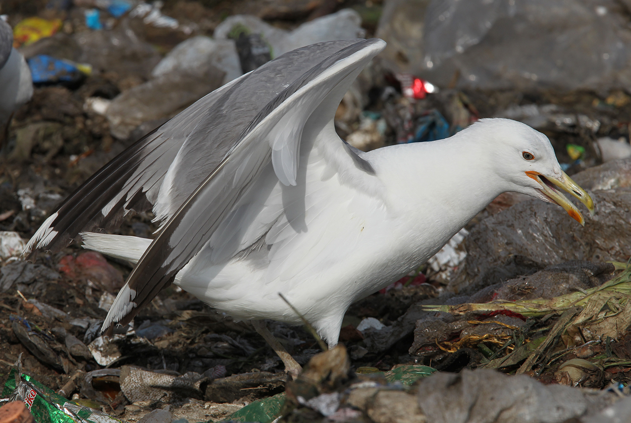 Larus cachinnans adult, July 03 2012, Baku landfill, Azerbaijan. Picture: Chris Gibbins. Long pale tongue on P10, medial band thinner than length of mirror+tip. Large mirror on P10, small sub-terminal black spots (triangles). Medium mirror on P9. |