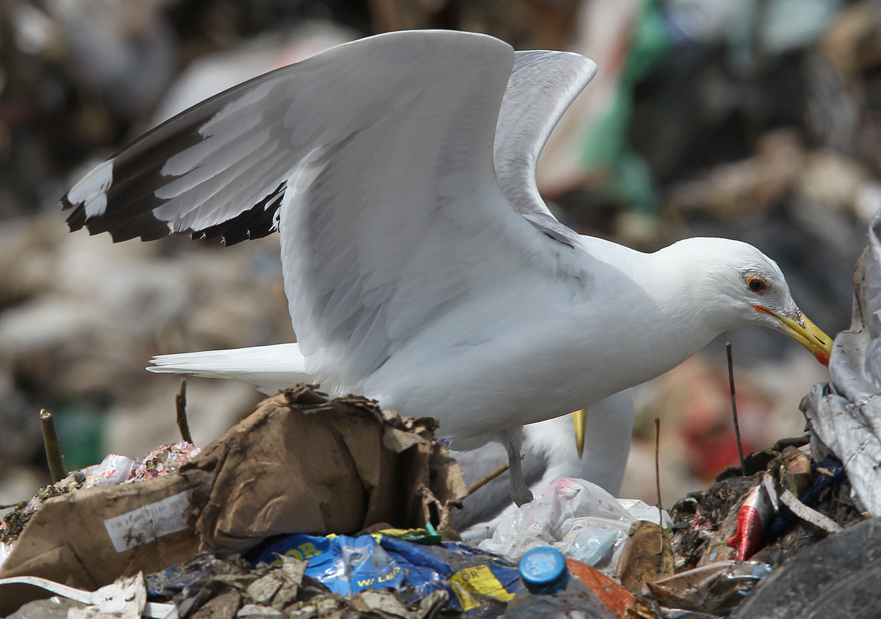 Larus cachinnans adult, July 04 2012, Baku landfill, Azerbaijan. Picture: Chris Gibbins. Short white tongue on P10, no smooth edge, curving back at inner edge. Medial band much broader than length of mirror+tip. Large mirror on P10, broad sub-terminal black band. Medium mirror on P9. |