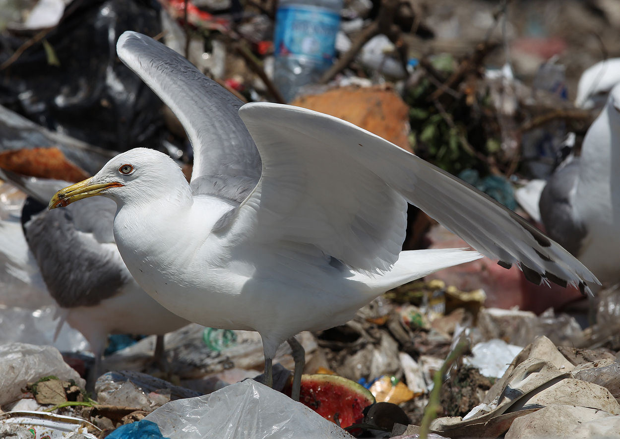 Larus cachinnans adult, June 22 2012, Baku landfill, Azerbaijan. Picture: Chris Gibbins. Long white tongue on P10 connected with mirror and tip, medial band broken ("thayeri" pattern). Large mirror on P10, no sub-terminal black. Large mirror on P9 and also broken medial band ("thayeri"