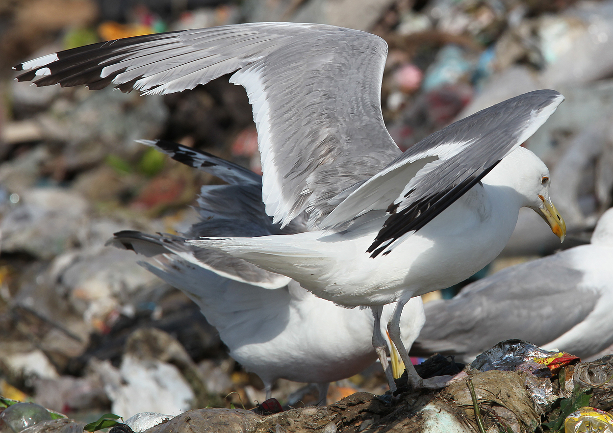 Larus cachinnans adult, June 28 2012, Baku landfill, Azerbaijan. Picture: Chris Gibbins. Large mirror on P10, full sub-terminal black band on P10. Small mirror on P9. |