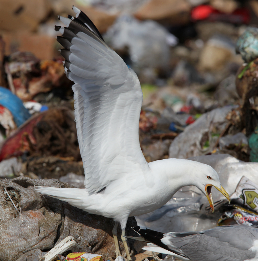 Larus cachinnans adult, June 28 2012, Baku landfill, Azerbaijan. Picture: Chris Gibbins. Long white tongue on P10, medial band thinner than mirror+tip. Large mirror on P10, full sub-terminal black band. |