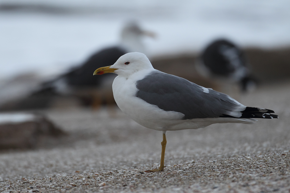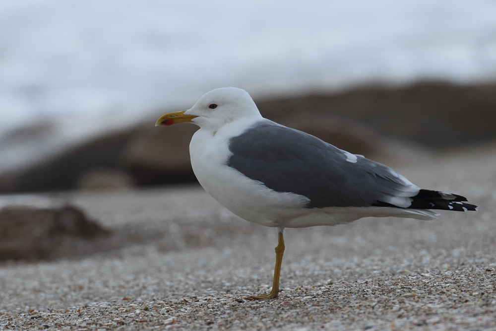 Larus cachinnans? adult, March 02 2012, Ashdod, Israel. Picture: Amir Ben Dov. Probably eastern cachinnans or barabensis (~intergrade): on underside P10, no pale tongue visible, instead: more black than white in P10 (medial band much broader than white tip). Also full broad subterminal band on P10 very rare in western cachinnans. Only tiny mirror on P9. Peppered iris. It seems (but sometimes difficult from images!) a rather dark backed bird, in fact too dark for cachinnans, almost approaching heuglini, but be aware of clouded conditions (bird casts no shadow). |