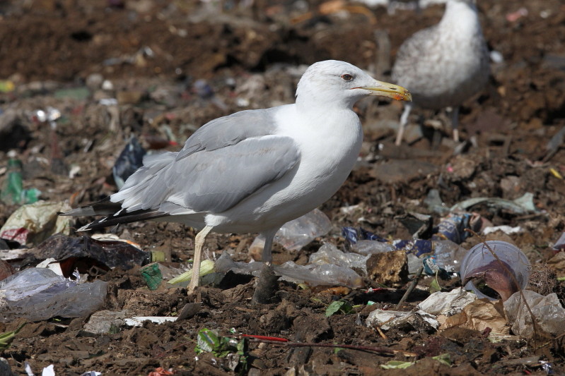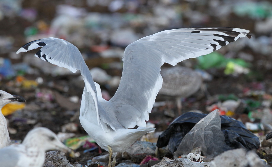 Larus cachinnans adult, September 2010, Dumpiai dump - Klaipeda, Lithuania. Picture: Chris Gibbins. P7/P9, with P8 growing; very small moult gap for Caspian Gull. Almost thayeri-pattern on P10. Simultaneous moult in outer secondaries (common moult strategy). A large and very aggressive (presumably male) bird. It was calling very regularly and seemed to dominate all other gulls present.